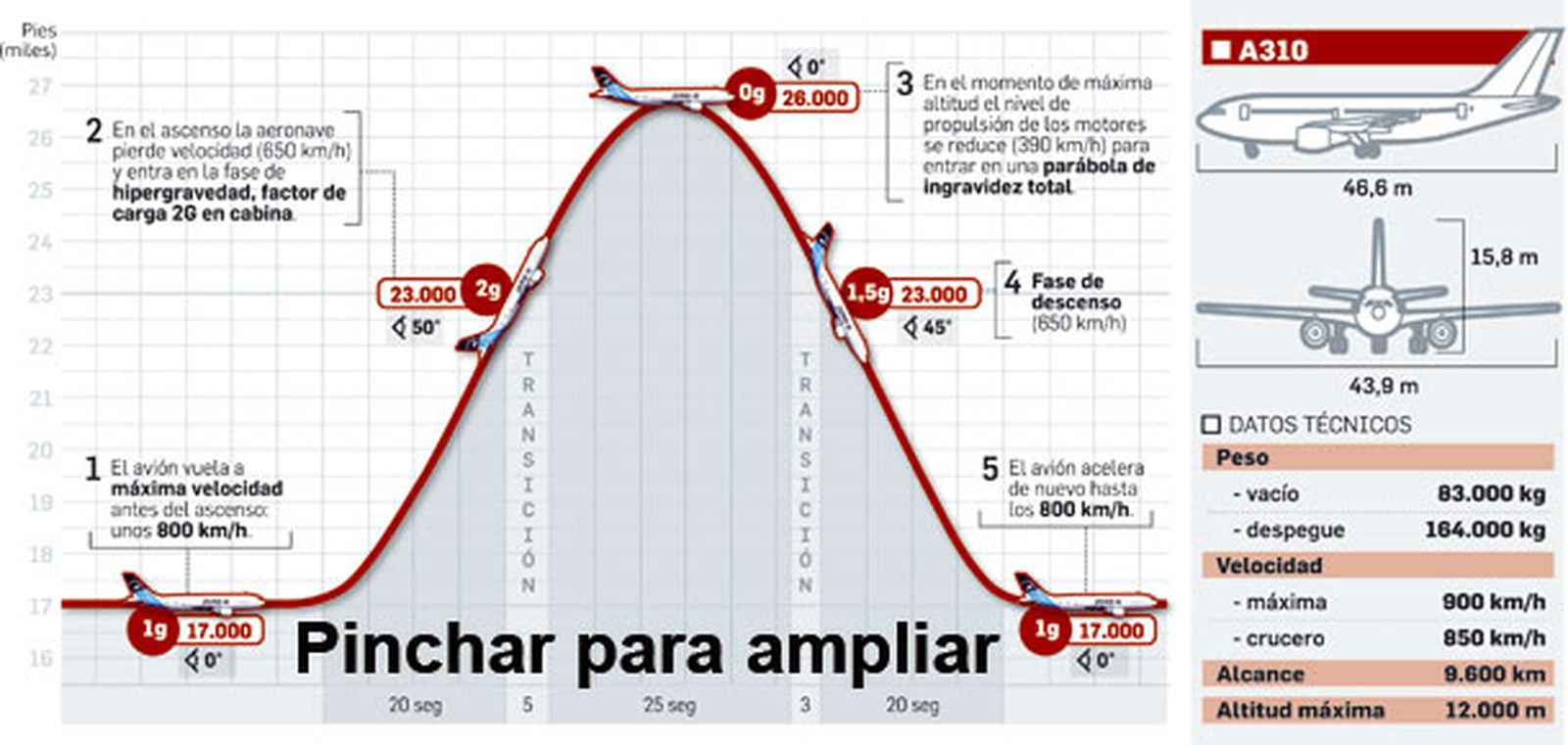 Los vuelos parabólicos reproducen una trayectoria orbital. Cada una de las parábolas permite 22 segundos de ingravidez. Durante este tiempo, los objetos y las personas a bordo pueden flotar libremente dentro de la cabina. Antes de la maniobra, el avión se mueve horizontalmente a una altitud de 20.000 pies. La tripulación prepara la parábola aumentando gradualmente la velocidad hasta alrededor de los 810 km/h, velocidad máxima permitida para este tipo de avión. Una vez alcanzada, el piloto empuja los mandos mientras la aeronave asciende durante unos 20 segundos a un ángulo de 47 grados. En este ascenso, se pierde la velocidad y se experimenta una fase de hipergravedad. Cuando se alcanza el punto de inyección, el ingeniero reduce significativamente la velocidad del motor y el piloto libera la presión sobre los mandos. El avión entra en fase parabólica y, consecuentemente, en la ingravidez. Cuando la aeronave cae en picado y alcanza un ángulo de 42 grados a una altitud de unos 25.000 pies, el piloto tira de nuevo de los mandos del avión para recuperar el nivel inicial de vuelo.