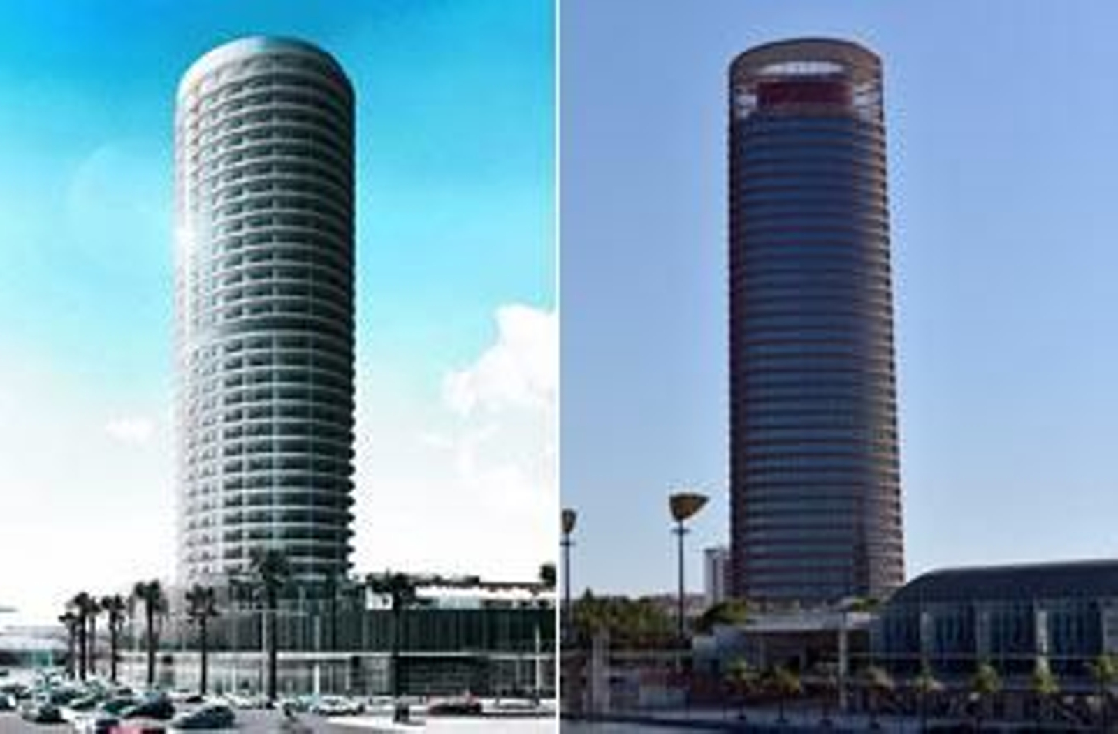 La aparición en escena del proyecto para el dique de Levante ha hecho que no pocos en la ciudad hispalense, de manera socarrona, hayan reflejado el interés de Málaga por copiar algo de Sevilla. Abriéndose incluso al comentario a las semejanzas de ambas torres. A bote pronto, sin entrar en disquisiciones técnicas, el ejercicio parece asumible. Al igual que hace Seguí con su trabajo, el rascacielos sevillano tiene forma elíptica, con 37 plantas, y dispone de vidrio y acero en sus fachadas.