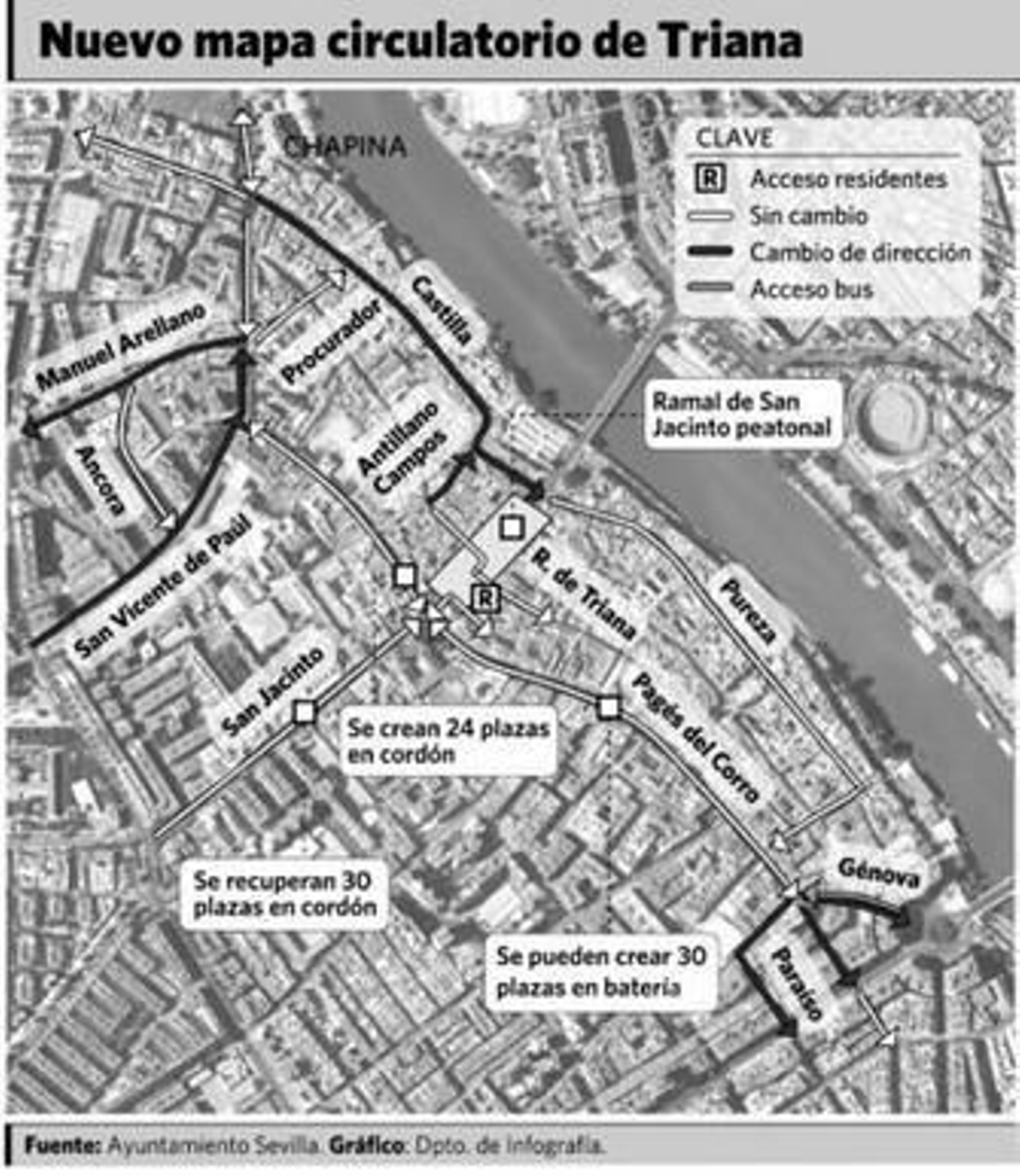 Ocho serán las calles que cambiarán de sentido para resolver la conexión con el centro tras el cierre al tráfico de la calle San Jacinto. Lo harán las calles San Vicente de Paúl (que tendrá sentido ascendente en dirección a Chapina); Clara de Jesús Montero (que quedará con un único sentido hacia Chapina), Castilla (que invertirá su sentido y será mano en dirección al Altozano), Manuel Arellano (que será de bajada desde Chapina a la Ronda de Triana), Antillano Campos (el tramo entre Alfarería y San Jorge se invertirá de sentido para permitir la circulación hacia el Altozano), Génova (tendrá sentido hacia la plaza de Cuba, pero conservará un contracarril reservado a Tussam), Pagés del Corro (el tramo entre República Argentina y la plaza Virgen de la Milagrosa) y Paraíso (que será ahora de bajada en dirección a República Argentina).