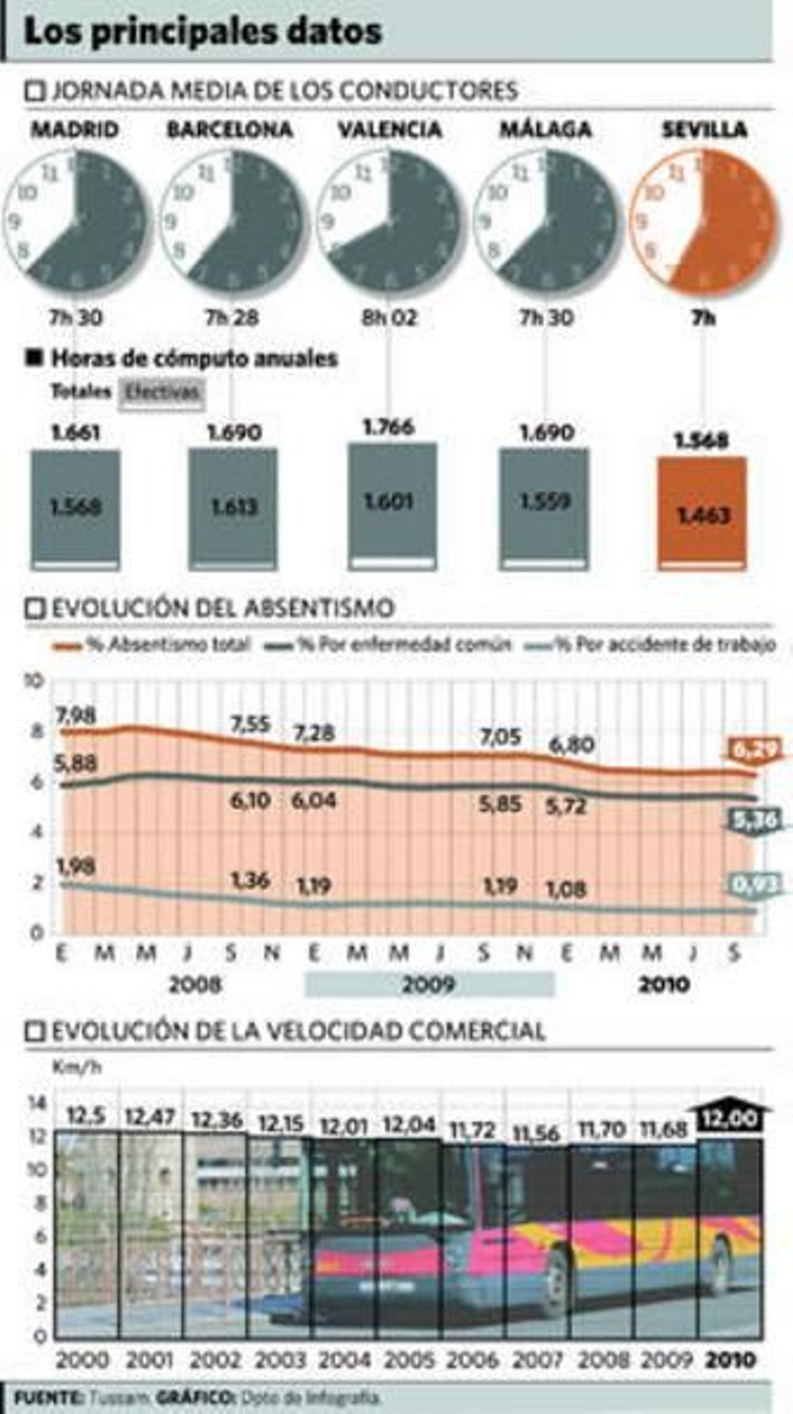Un estudio interno de Tussam refleja que sus conductores pasan "un tiempo diario medio con pasajeros que asciende a poco más de seis horas y quince minutos". El mismo documento, al que ha tenido acceso Diario de Sevilla, establece que la jornada laboral media de los chóferes es de siete horas, por debajo de la de las empresas de transporte urbano de Madrid (7,30 horas), Barcelona (7,28), Valencia (8,02) o Málaga (7,30). El estudio recoge que en Tussam rige el convenio de las 35 horas de trabajo semanales. La aplicación pactada en convenio colectivo supuso en Sevilla entre 30 y 60 minutos menos de conducción por jornada que en el resto de las grandes ciudades. La jornada diaria en Tussam está, además, reducida en 30 minutos por el descanso intermedio, "lo que hace que la productiva sea sólo de 6,30 horas. Como la jornada debe incluir legalmente la incorporación y retirada de vehículos al itinerario de la línea, la toma del servicio, los desplazamientos, las incidencias y las esperas, "en realidad el tiempo diario medio con pasajeros asciende a poco más de 6 horas y 15 minutos", como reza la conclusión de un estudio presentado por la empresa en el último consejo de administración.