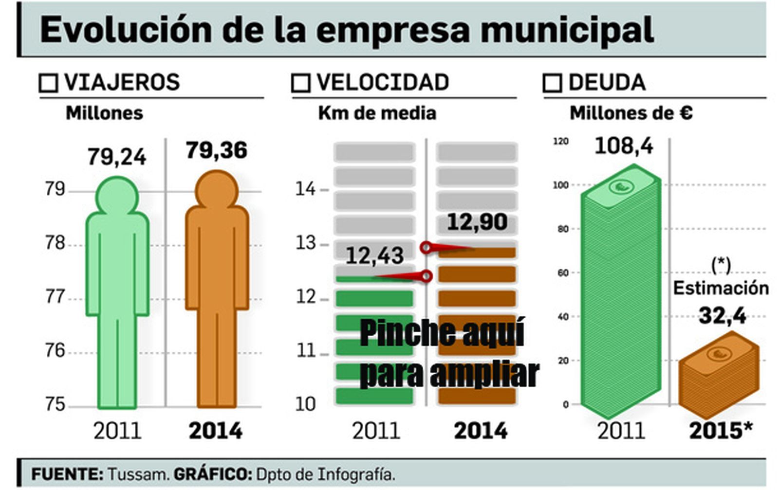 El ahorro de la aportación municipal para Tussam ha llegado a los 2,2 millones y se ha rebajado la deuda un 70%, por lo que a finales de 2015 ésta sólo será de 32,4 millones, frente a los 108,4 de 2011. Uno de los mayores logros de esta empresa afecta a los trabajadores, que cobran su salario el mismo día que los empleados del Ayuntamiento tras años de dificultades. El consejo de administración de la Empresa Municipal de Transportes Urbanos de Sevilla aprobó a finales de marzo las cuentas de 2014 con un beneficio que alcanza los 1,9 millones de euros. También destaca la mejora significativa del patrimonio neto a 31 de diciembre del pasado año, situándose en 81,6 millones frente a 75,02 millones de 2013, con un incremento del 8,8%.