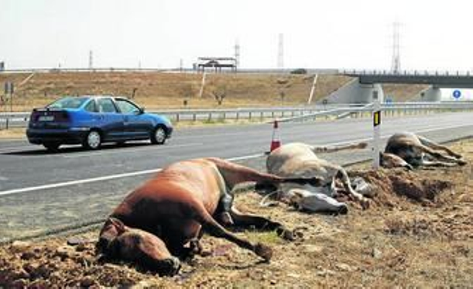 Un herido grave y cuatro caballos muertos. Éste es el resultado del accidente de tráfico que se produjo la madrugada del pasado domingo en la SE-40 -a la altura de la fábrica de Heineken- y cuyas causas investiga la Guardia Civil. Los cadáveres de los animales continuaban este lunes por la mañana junto a la calzada a la espera de ser recogidos.