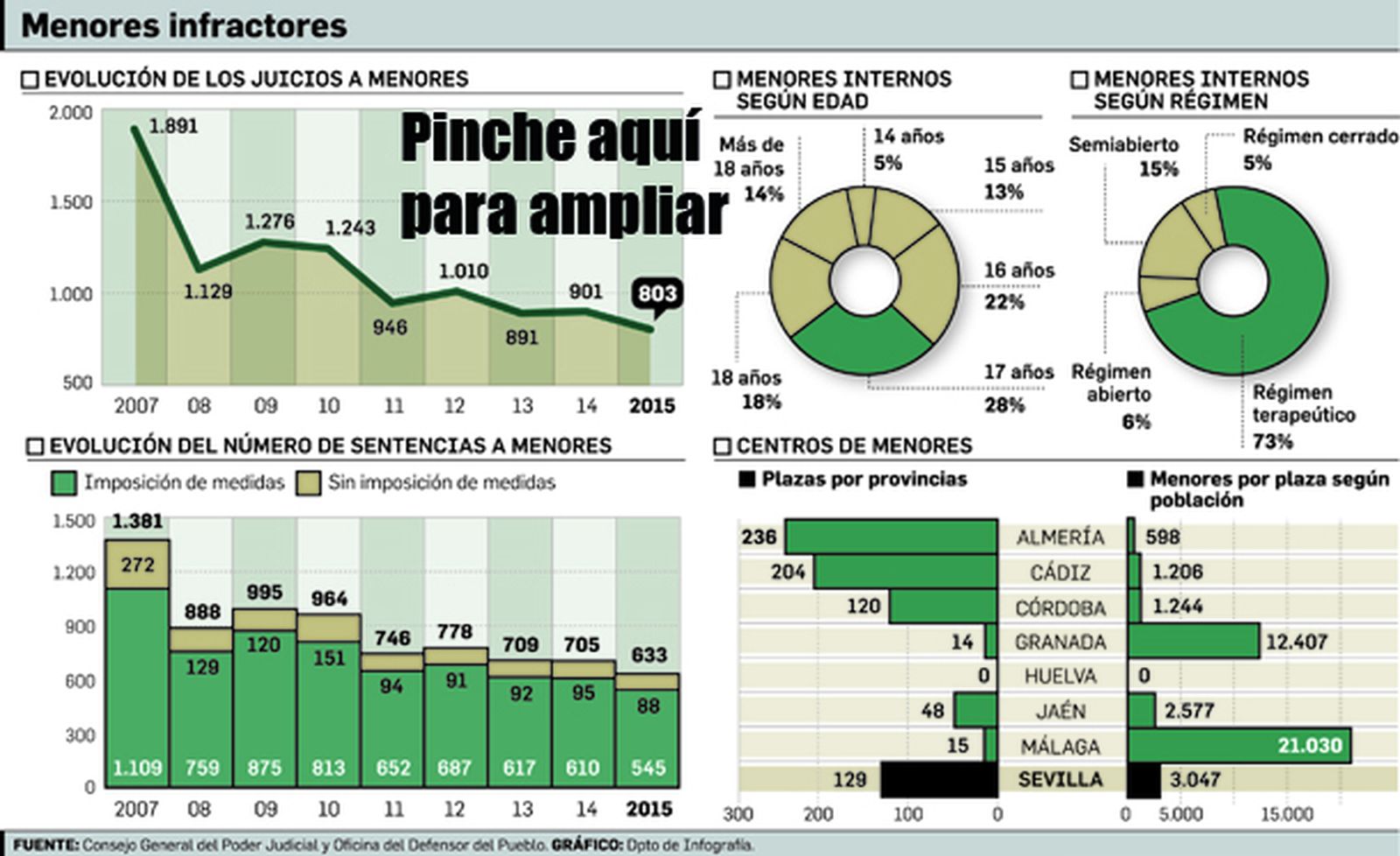 En Andalucía hay 15 centros de internamiento para menores, cuatro de ellos en Sevilla, concretamente en Dos Hermanas, Alcalá de Guadaíra y Carmona. Almería es la provincia con mayor número de plazas (236), seguida de Cádiz (204) y Sevilla (129). Pero también hay casos extremos como los de Granada y Málaga, con 14 y 15 plazas para toda la provincia, y en Huelva ni siquiera hay un centro.
