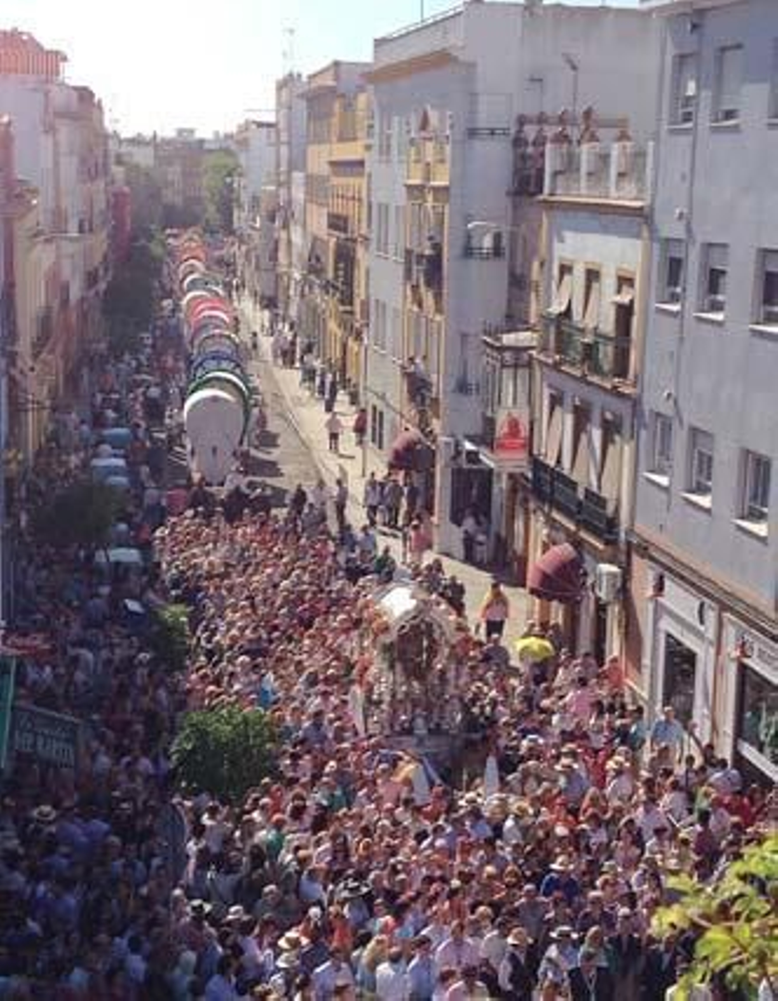 Todo Rocío tiene su momento de inicio. Unos lo hacen asistiendo a la misa de romeros en la angosta capilla trianera, otros entonando el cuerpo con una copa de aguardiente cuando el sol aún es benévolo y otros -todo haya que decirlo- pisando las heces equinas que alfombran la calle. Es la huella indeleble del calzado peregrino en una alegre mañana en la que se echan en falta mantones y matas de romero en los balcones, como pregonaba aquella sevillana que repiten de boca en boca varios trianeros.