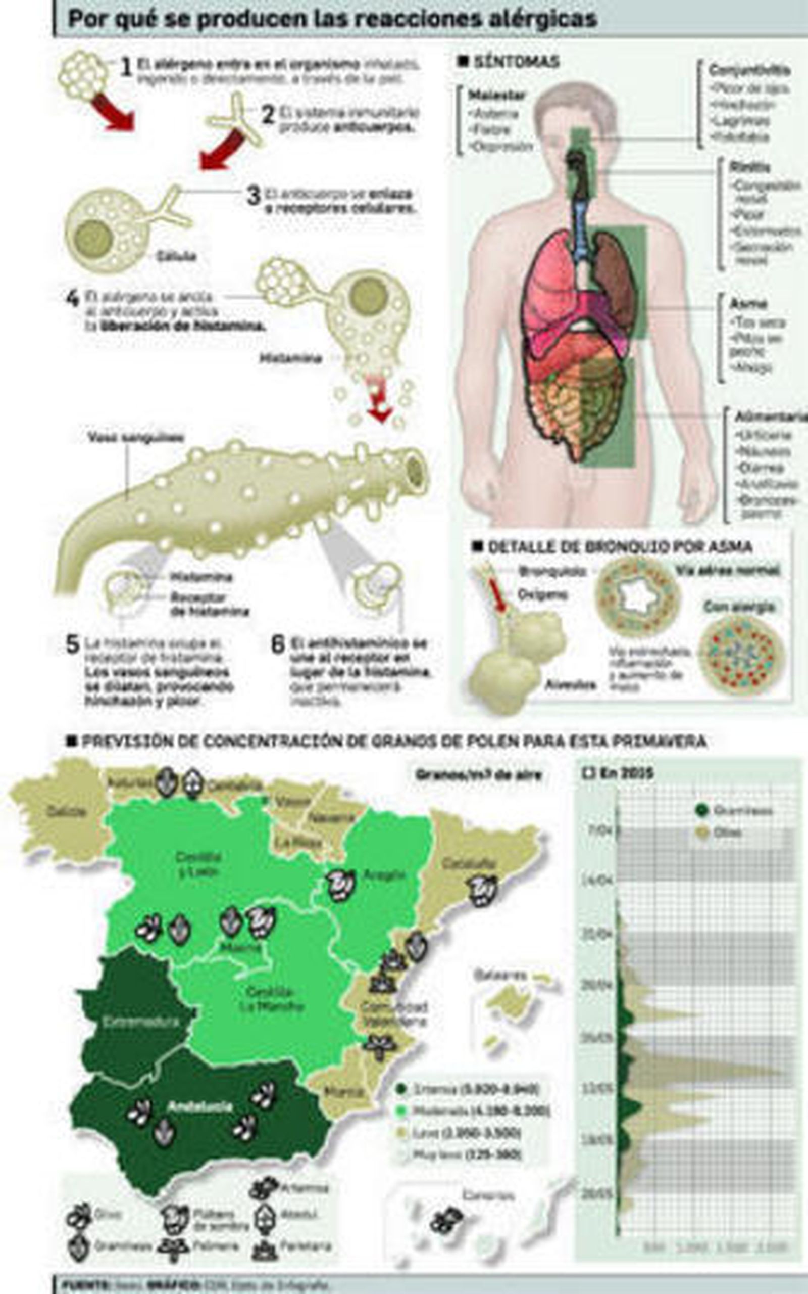 Esta temporada, no obstante, se han registrado índices inferiores de polen respecto a otros años, al menos, en lo que se refiere a los denominados pólenes de invierno, como es el ciprés, cuya floración comienza en enero. "Este año, hasta ahora, el ciprés y el plátano de sombra han registrado cifras inferiores respecto a otras primaveras; mientras que otros pólenes que suelen aparecer en esta época, como el olivo o las gramíneas, aún no han hecho acto de presencia", explica el doctor Orta. No obstante, estas dos últimas especies pueden aflorar de manera explosiva en cualquier momento si las condiciones meteorológicas son favorables a la polinización. Las escasas lluvias de este invierno han incidido en una primavera suave, al menos, hasta la fecha en lo que se refiere a los problemas de alergia. "En las consultas apenas estamos viendo casos", añade el especialista.