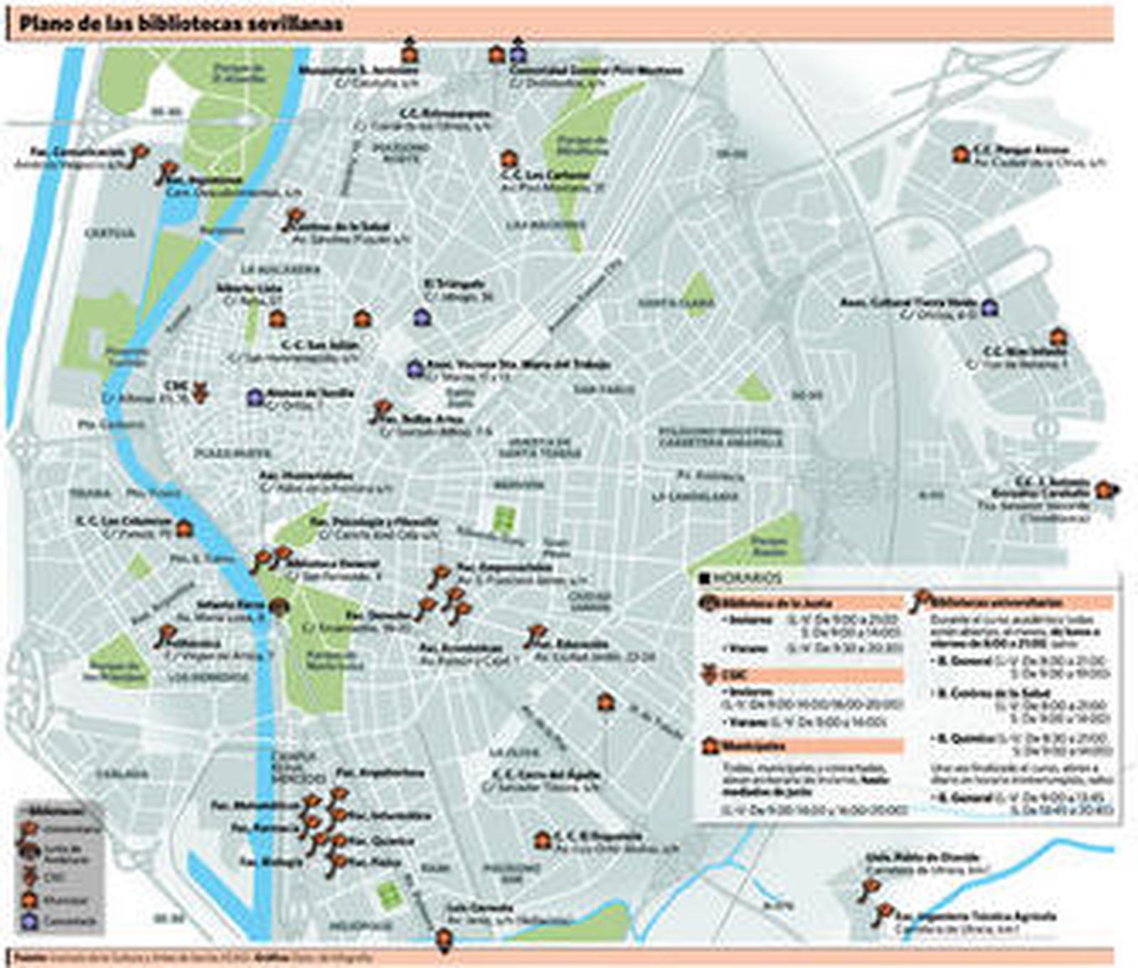 Las 12 bibliotecas -como muestra el gráfico adjunto- se distribuyen por los diferentes distritos en los que se divide la ciudad. A ellas pueden acceder los ciudadanos, a los que, en teoría, se les ofrece todos los servicios: consulta, lectura y préstamos de libros, además de atender las desideratas, es decir, la petición de un usuario para que se incluya una obra que no consta en el catálogo bibliotecario. El horario de apertura es igual para todos ellos: de 9:30 a 14:30 y de 16:00 a 21:00. Únicamente se altera en vacaciones, esto es, en Navidad, Semana Santa, Feria y, por supuesto, verano, cuando se establece la jornada intensiva: de 9:00 a 14:00. Por las tardes, están cerradas.