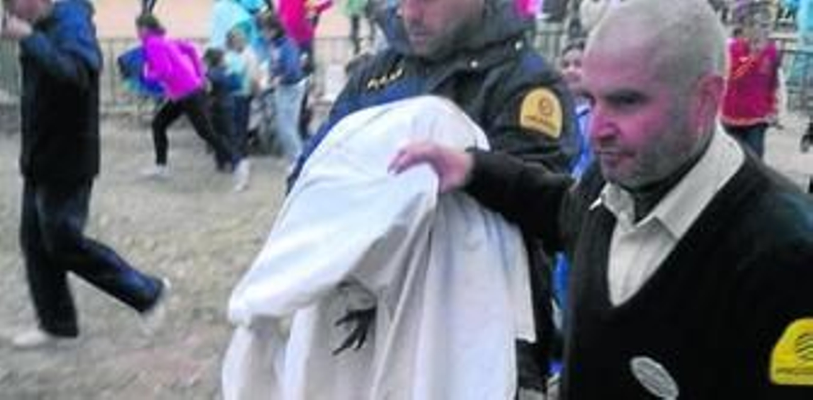 El personal de seguridad del parque atrapa un ave rapaz que se posó en el suelo.