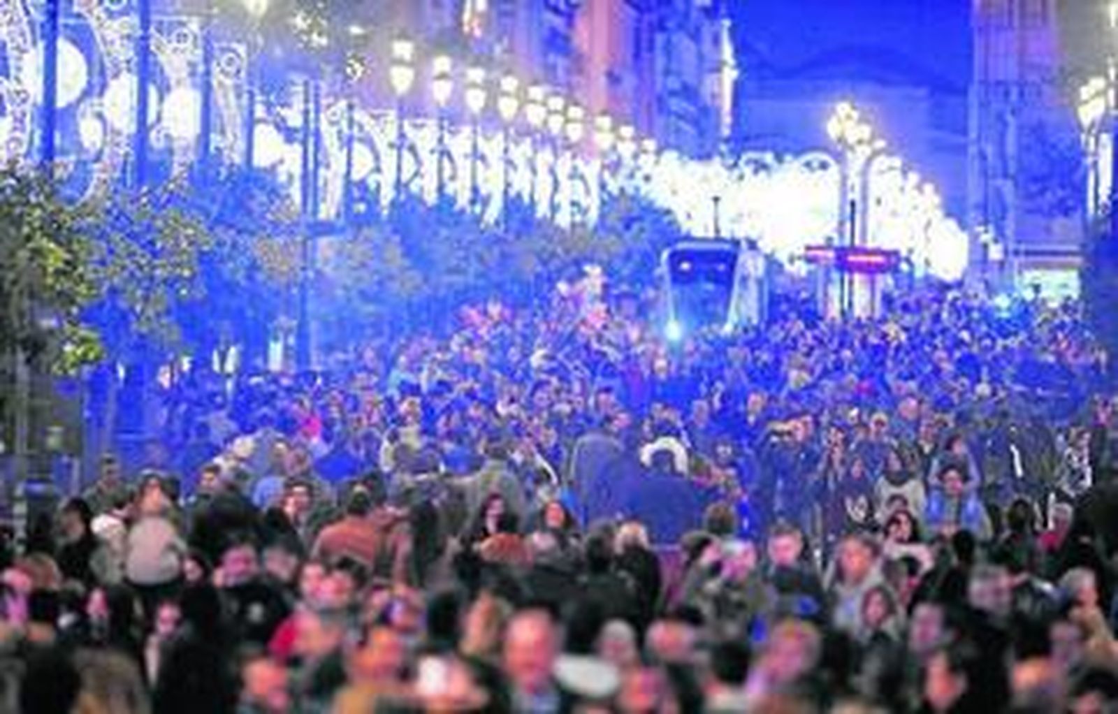 Anochece con una luna redonda y espléndida. Dentro de la catedral, suena el órgano en la misa de la Capilla Real; fuera, espera algún cliente Iván, un joven veterano cochero de caballos. "Mucha gente, pero poco gasto". Más le valdría utilizar ese vehículo a algunos de los conductores que se ven atrapados en un tremendo atasco que llena de luces e impaciencia Hernando Colón, Entrecárceles y Cuesta del Rosario. Luces de la ciudad, homenaje a Chaplin, que antes era un regalo de Navidad para los niños y ahora no saben quién es. Luces en el árbol de la Puerta de Jerez; en el portal junto al Alcázar. Luces en los adornos de la Avenida de la Constitución, que ayer fue su santo. 27 números en los impares, 40 en los pares.