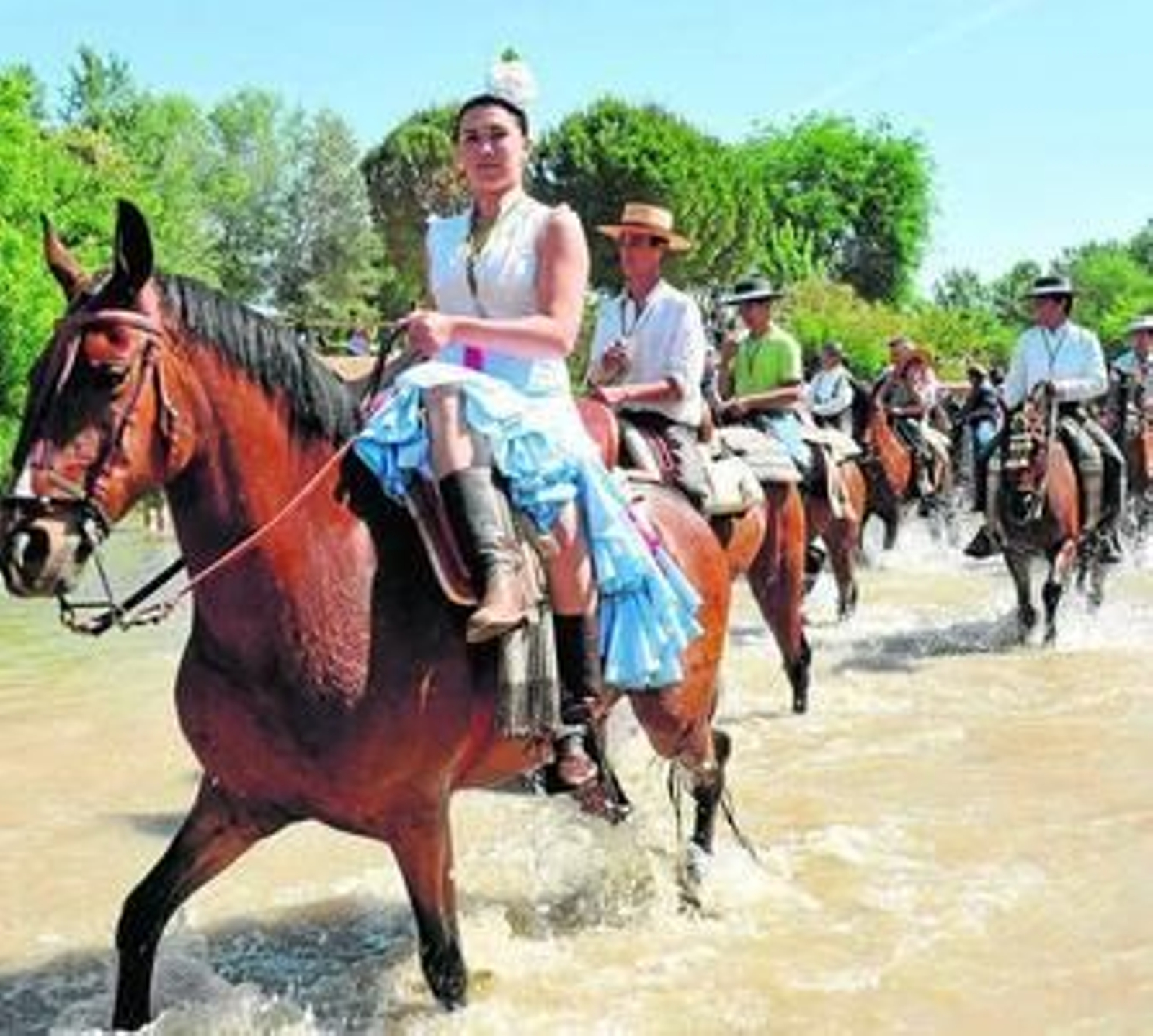 Llegan hasta el vado del Quema las estampas más genuinas de la romería. Agua refrescante para los romeros de Camas, Gines y la Palma de Gran Canaria. Ellos ya saben lo que es andar el camino. A los que lo iniciaron ayer les queda aún cambiar el asfalto por la tierra. Metamorfosis rociera que experimentan los pies cansados cuando el calor también se hace peregrino.