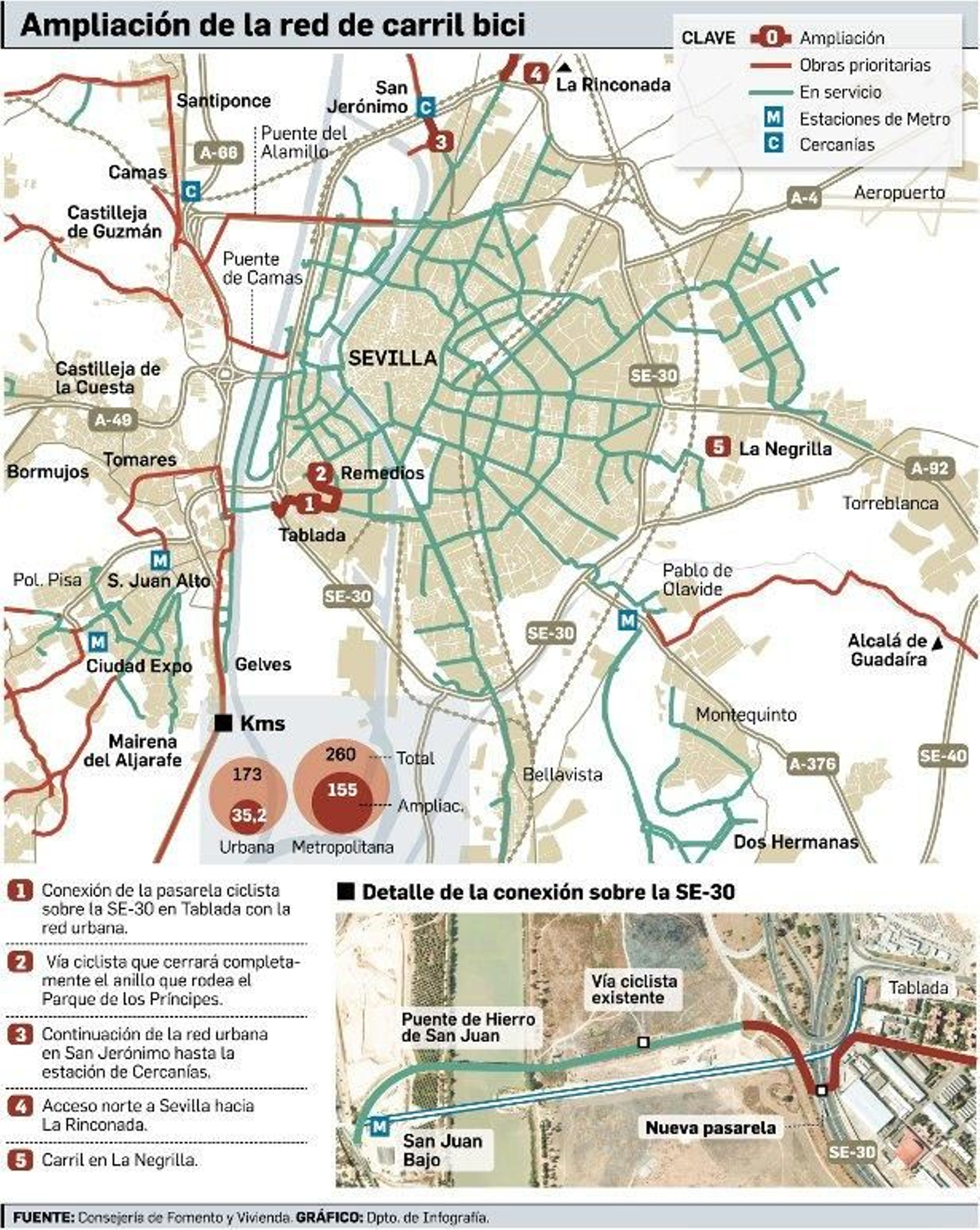 El Plan andaluz necesita una inversión de 402 millones de euros hasta el año 2020. En 2013, la consejería presupuestó 10 millones de euros que servirán para iniciar de aquí a diciembre la obra de la pasarela ciclista y peatonal sobre la SE-30 que unirá sin obstáculo alguno y por primera vez San Juan con Sevilla a la altura de Tablada. Es una demanda histórica de los ciclistas. La adjudicación de las obras aguarda a que la mesa de contratación acabe de estudiar las ofertas presentadas, según explicó la delegada territorial.