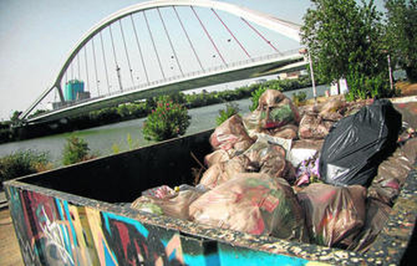 Más adelante aún, restos de basura se esparcen por el césped en el que muchos turistas aprovechan para tomar el sol, ya casi junto al Puente de Triana. El lugar es escenario habitual de botellonas, como acreditan las múltiples piezas de vidrio que se quedan entre los adoquines. Al otro lado del puente, hay un carril bici de tablas en el que faltan algunos listones y otros están combados.
