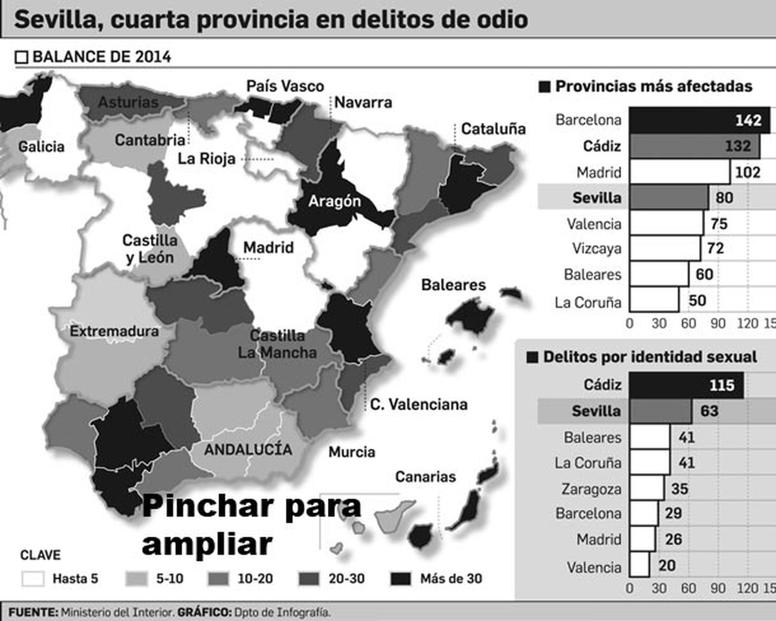 El 78,7% de los incidentes registrados en Sevilla en 2014 están relacionados con la orientación o la identidad sexual de la víctima. Así, Cádiz, con 115 hechos, y Sevilla, con 63, lideran la lista de las provincias españolas más afectadas por este motivo, según el informe elaborado por el Ministerio del Interior. La fiscal sevillana matiza que "son delitos difíciles de identificar y que en muchos casos chocan con otros derechos como la libertad de expresión".