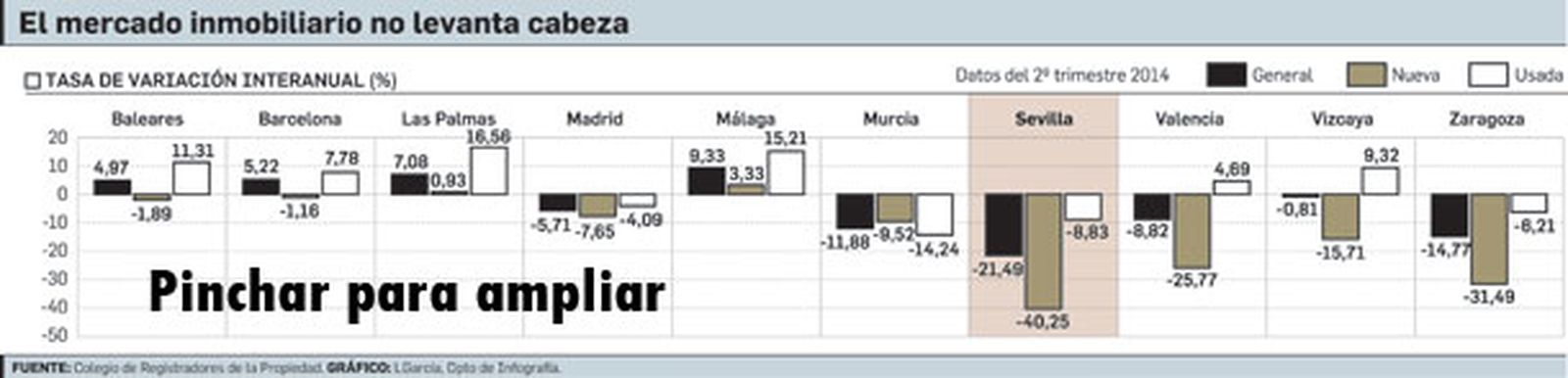Comparando la provincia de Sevilla con otras de la geografía nacional (las diez con más habitantes), se obtiene que es la que sale peor parada este segundo trimestre de 2014. En negativo también se encuentran Baleares (-1,9%); Barcelona (-1,2%); Madrid (-7,7%); Murcia (-9,5%); Valencia (-25,8%); Vizcaya (-15,71%) y Zaragoza (-31,5%). En el lado contrario sólo nos encontramos con subidas a Las Palmas (0,9%) y Málaga (3,3%). Respecto a las comunidades, Andalucía fue la que obtuvo un mayor número de compraventas registradas, con 15.583, seguida de Cataluña (11.980), la Comunidad Valenciana (11.591) y la Comunidad de Madrid (10.522).