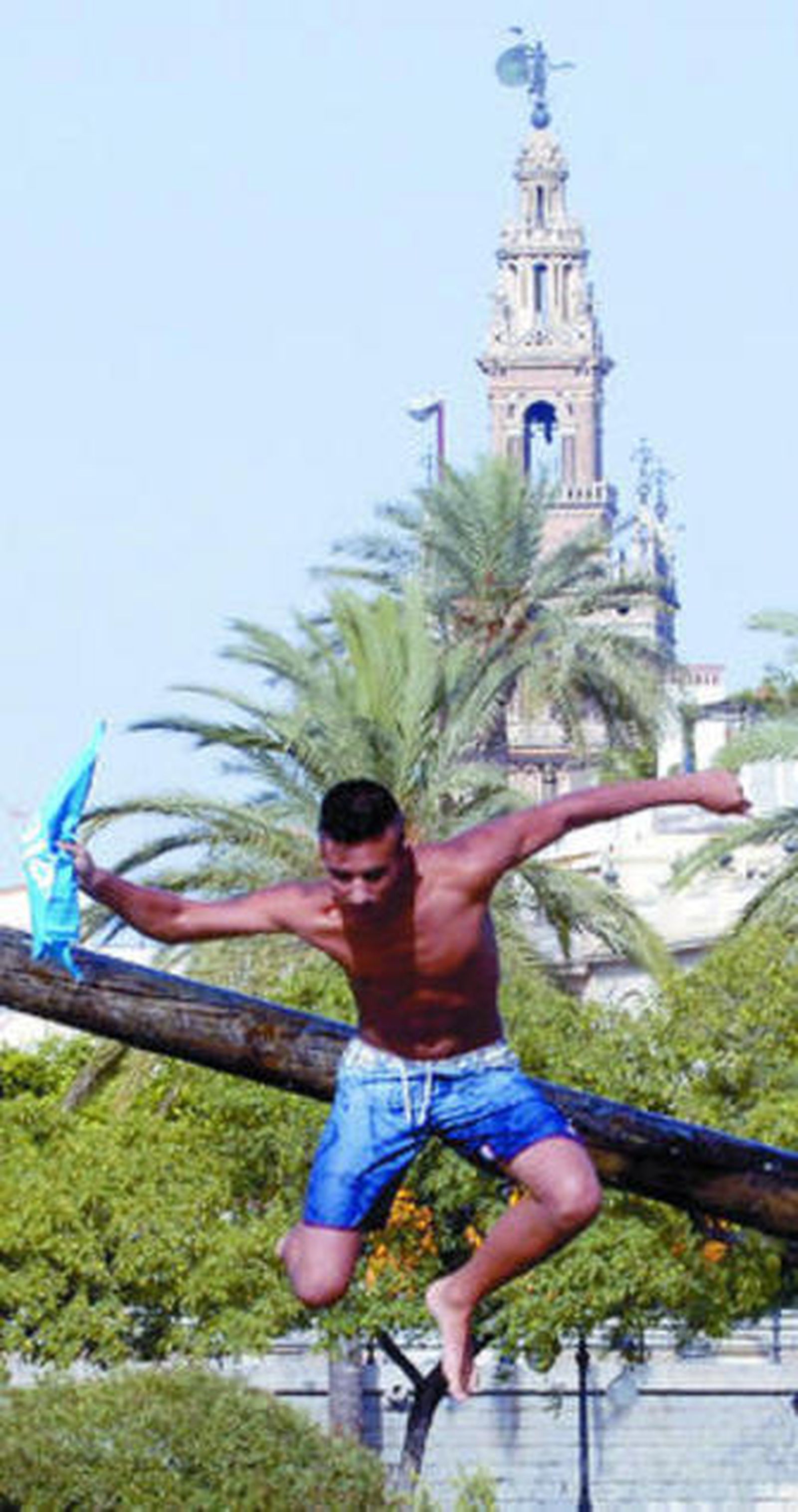 La segunda jornada de la Velá de Santiago y Santa Ana en el barrio de Triana comenzó ayer a las seis de la tarde con el ya clásico concurso de cucañas. Los participantes -divididos en categoría juvenil y adulta- pusieron a prueba sus habilidades para alcanzar las banderas. Agilidad y equilibrio son importantes para no acabar empapado en las aguas del río, pero también es imprescindible tomar un buen impulso si uno no quiere quedarse sin fuerzas en mitad del recorrido.