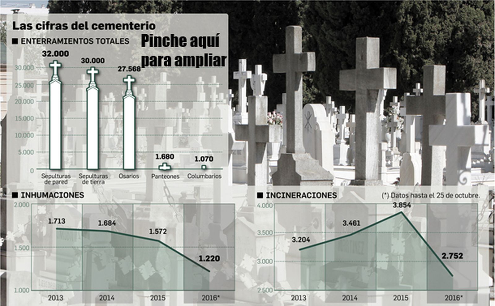 Pese a este descenso, el número de incineraciones sigue siendo bastante más alto que el de las inhumaciones, que hasta finales de octubre ha sido de 1.220, por lo que el año se cerrará con una cifra por debajo de la de 2015, cuando se registraron 1.572 enterramientos, lo que supuso una merma del 8,25% respecto al ejercicio anterior.