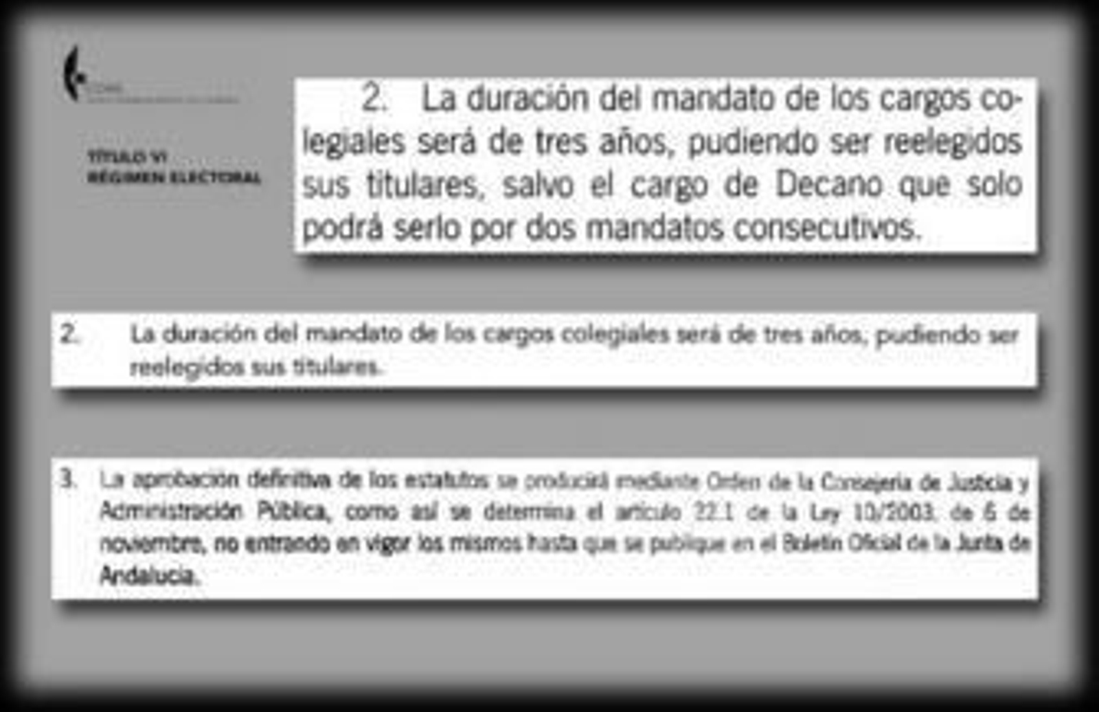 La cuestión clave de esta controversia, que esta semana ha empezado a derivar ya en un grueso cruce de acusaciones personales entre Del Río y sus cinco antecesores en el cargo -que han emitido un comunicado de ex decanos en el que le acusan de querer "perpetuarse" en la institución al "mutilar" los estatutos del Colegio-, radica en saber cuáles de los dos en liza son los que realmente deben tenerse en cuenta como referencia legal. Si los aprobados en 2001, cuando el Colegio de Sevilla se segregó del antiguo Colegio de Andalucía Occidental, o los de 2004, todavía "no vigentes", como sostiene la Junta en un escrito oficial.