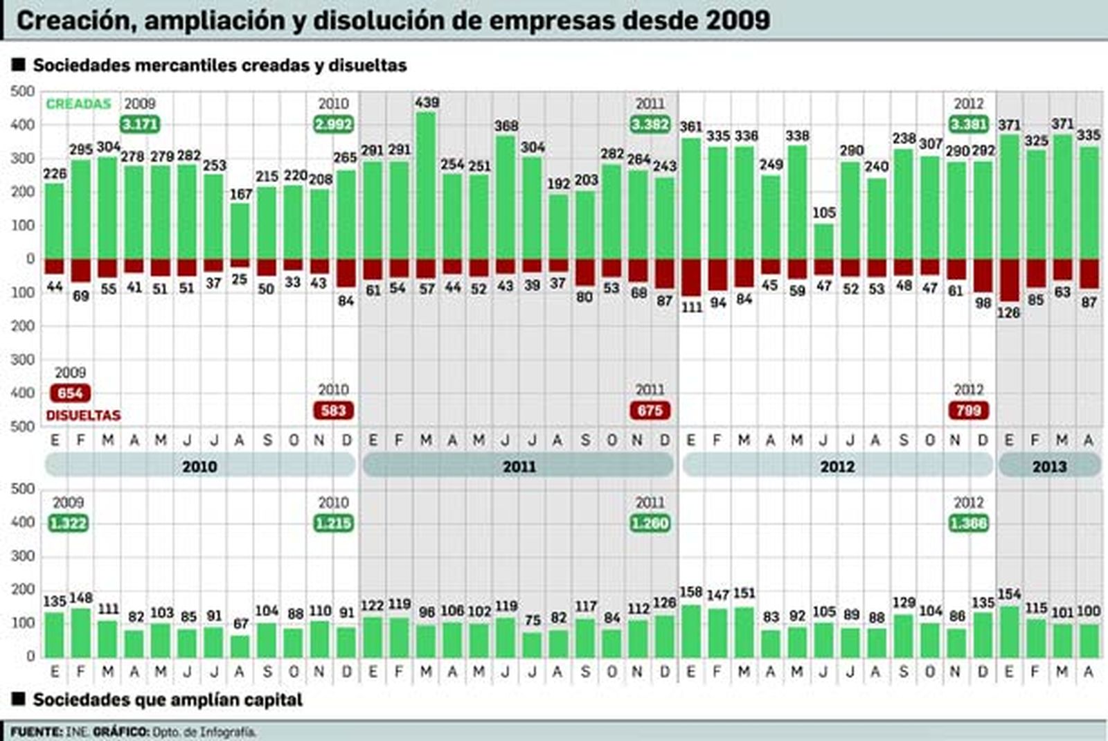 El dato de abril es, además, uno de los más importantes en la serie publicada por el INE. La creación de empresas en dicho mes ha sido bastante alta y también una de las más destacadas, sólo superada por junio de 2011, cuando se fundaron 368 compañías, marzo de 2012 (336), mayo del año pasado (338) y los referidos enero y marzo del presente ejercicio.