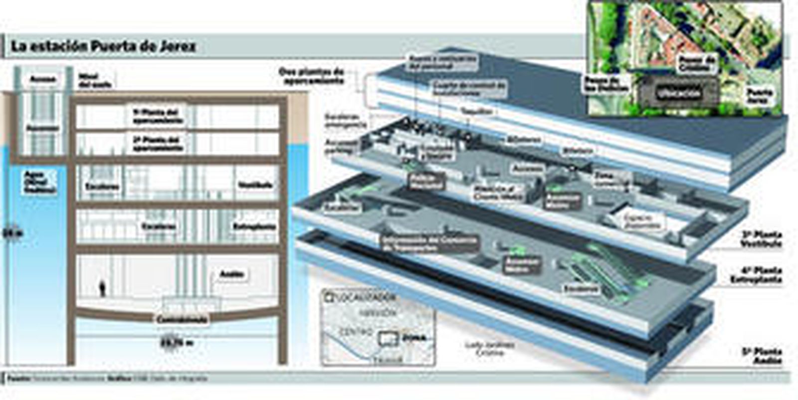 La prudencia de la Administración es lógica en este caso, puesto que no se sabe qué demanda real tendrá una estación situada bajo el Cristina cuyos andenes se encuentran a unos 25 metros de profundidad y en una estructura de cinco plantas bajo el suelo: las dos primeras más superficiales corresponden al aparcamiento rotatorio y las tres siguientes a la estación (ver gráfico). El uso del ascensor, por tanto, será más práctico que las escaleras mecánicas para acceder al interior. No en vano, la consejera de Obras Públicas y Transportes, Rosa Aguilar, ha convocado a la prensa a las 12:15 en la estación San Juan Bajo para que el acceso a Puerta Jerez e cámaras y periodistas sea directamente en tren, en lugar de hacerlo desde la superficie.