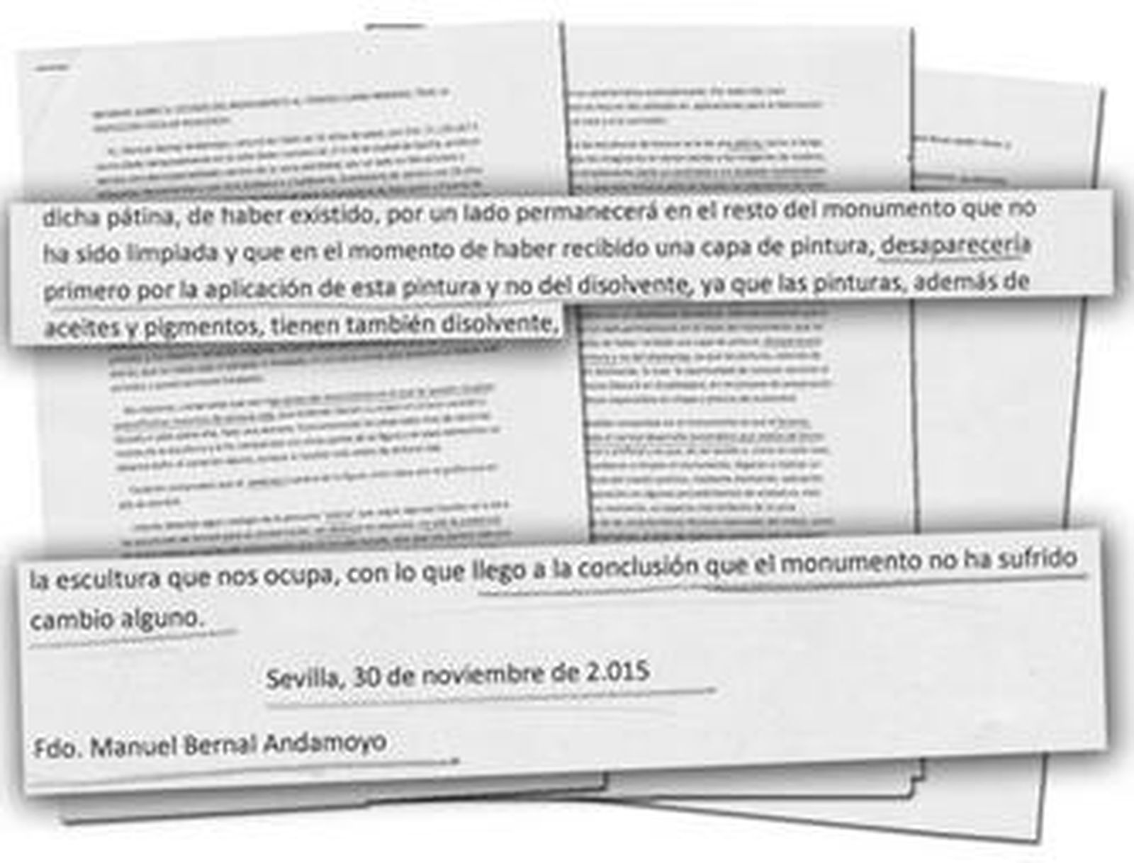 El informe elaborado por Manuel Bernal Andamoyo, experto en metalurgia con más de 25 años de docencia, no detecta en la figura esculpida ningún vestigio de pátina: "La pátina no ha desaparecido en ninguna parte del monumento o no existe en la actualidad en ninguna región, si es que realmente ha existido en algún momento". La inspección ocular realizada al monumento desvela que el bronce ha experimentado el desarrollo automático de cualquier metal. Nada de daños por la limpieza. Es más, el experto considera que si la pátina ha existido alguna vez, "desaparecería primero por la aplicación de la pintura y no del disolvente utilizado en la limpieza, ya que las pinturas, además de aceites y pigmentos, tienen también disolventes". El profesor concluye que el monumento no ha sufrido cambio alguno.
