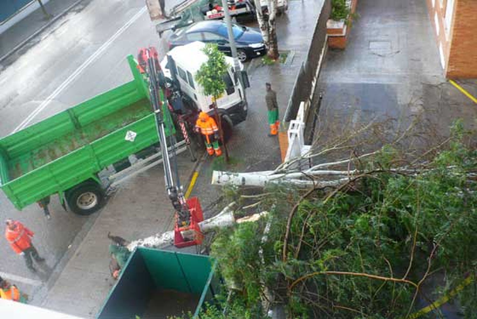 Los servicios de limpieza de Lipasam se desplazaron hasta la zona para retirar el árbol; una maniobra que tuvieron que realizar con la ayuda de una grúa debido al tamaño y al peso del árbol.
