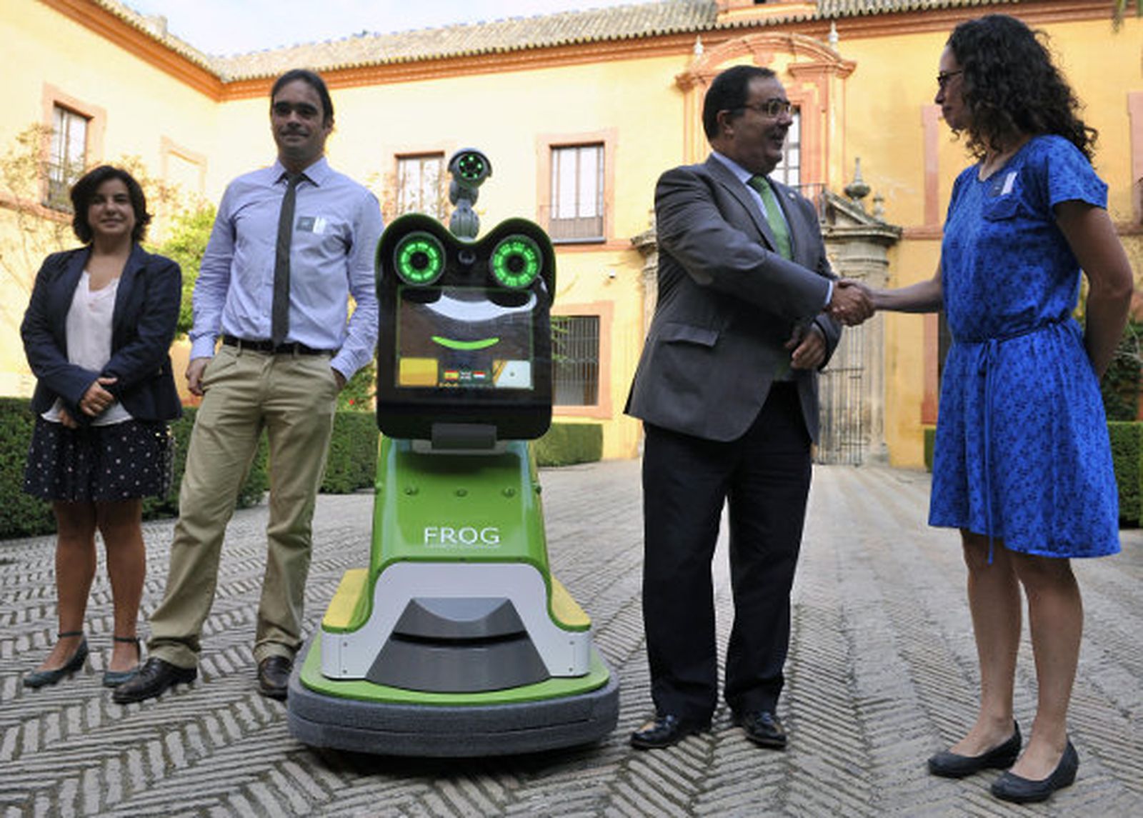 Pesa alrededor de cien kilos, tiene pantalla táctil y es trilingüe al dominar el español, el holandés y el inglés. Se trata de FROG(Fun Robot Outdoor Guide), un autómata con forma de rana verde que hace las labores de guía del Real Alcázar: "Se llama Sala de las Bóvedas porque todavía cuenta con las cúpulas de estilo gótico que fueron construidas por Alfonso X". Ésta es una de las explicaciones que el peculiar robot ofreció ayer a los turistas. Los visitantes atendieron, con una mezcla de curiosidad y asombro, cada descripción y cada comentario que el inusual interlocutor realizó en las estancias del histórico palacio.