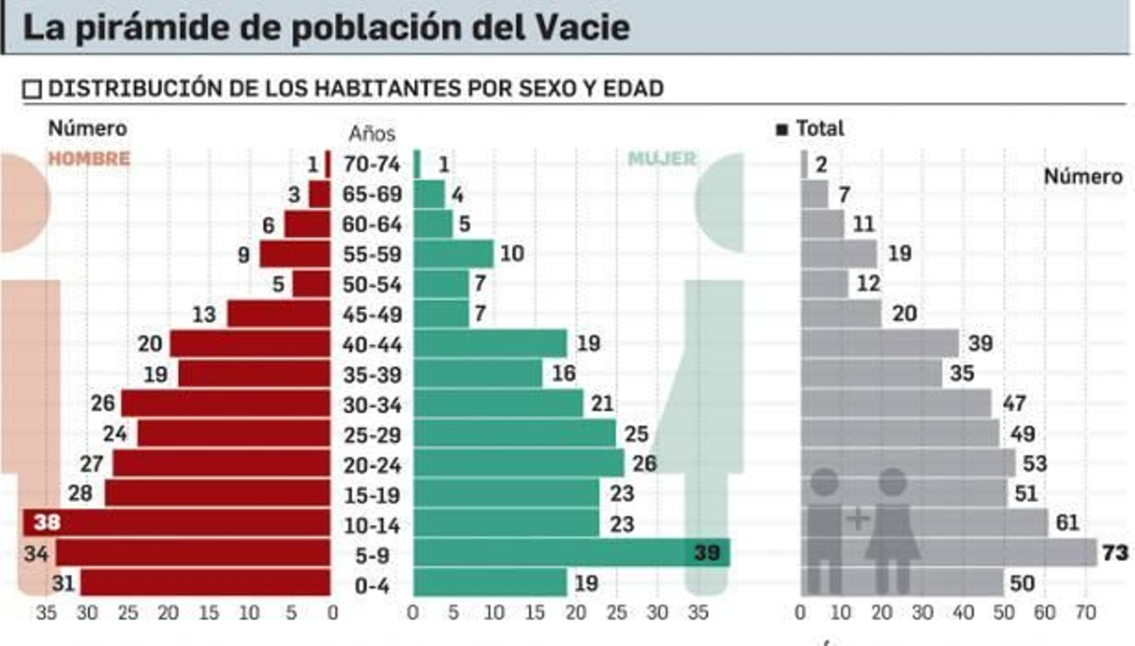 Los datos que se ofrecen en este estudio son relativamente recientes, del 26 de febrero de 2016. De los 529 habitantes del asentamiento, 284 son hombres y 245 mujeres. Se trata de una población muy joven, con 197 menores de 16 años (107 niños y 90 niñas). El estudio del Comité René Cassin permite dibujar una pirámide de población del Vacie que resulta muy distinta a la del resto de la ciudad y se aproxima más a la de cualquier país subdesarrollado que a la de una nación europea. Así, la franja de edad entre los 5 y los 9 años es la más numerosa, seguida de la de entre 10 y 14. La pirámide va disminuyendo a medida que avanza la edad y apenas hay ancianos viviendo en el poblado, puesto que sólo hay dos personas mayores de 70 años y siete con edades comprendidas entre los 65 y los 69. Esta situación contrasta enormemente con la de finales de la década pasada, en la que había bastantes más personas de edad avanzada. Una de ellas, María Díaz Cortés, murió en enero de 2009 con 117 años, siendo una de las personas más longevas del planeta.