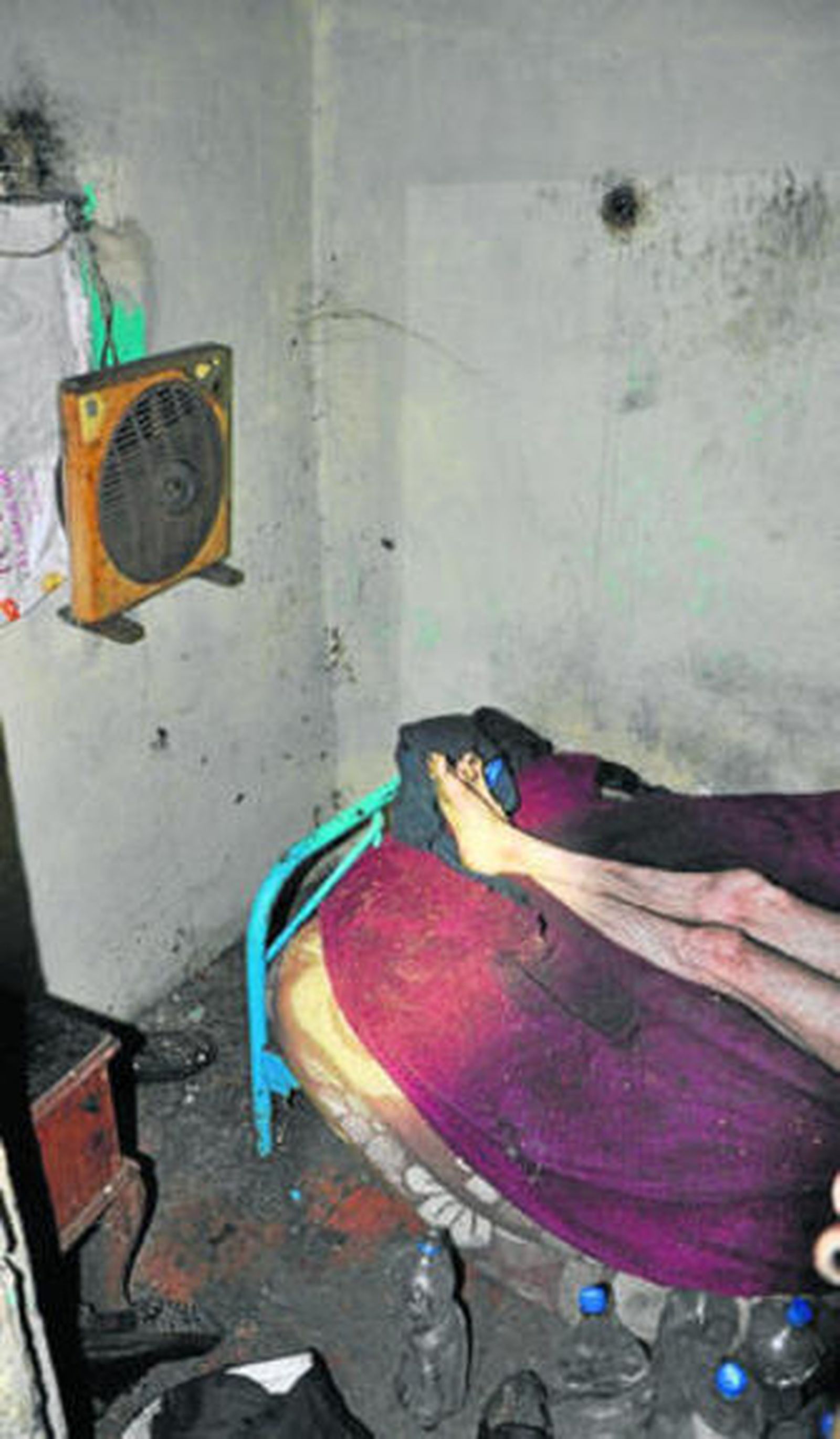 Los agentes pidieron a ambos que abrieran la puerta para comprobar el estado en el que se encontraba el hermano pequeño. Una vez la atravesaron, encontraron otra puerta con una traviesa de madera encajada que impedía el paso. Tras franquear esta segunda puerta, los policías se encontraron con una escalera ruinosa y estrecha que ascendía a una especie de palomar, según relata la nota de prensa emitida ayer por la Jefatura Superior de Policía. Al entrar en este cuartucho sin techo, de unos tres metros cuadrados, encontraron a un hombre completamente desnudo, tumbado en un colchón. Su estado de salud e higiene, añade la nota policial, era lamentable y las condiciones del lugar eran completamente insalubres, con botellas y cubos donde hacía sus necesidades básicas, sin acceso a agua corriente ni a un aseo. En la estancia apenas había muebles, más allá de un mugriento ventilador y una vieja mesita.