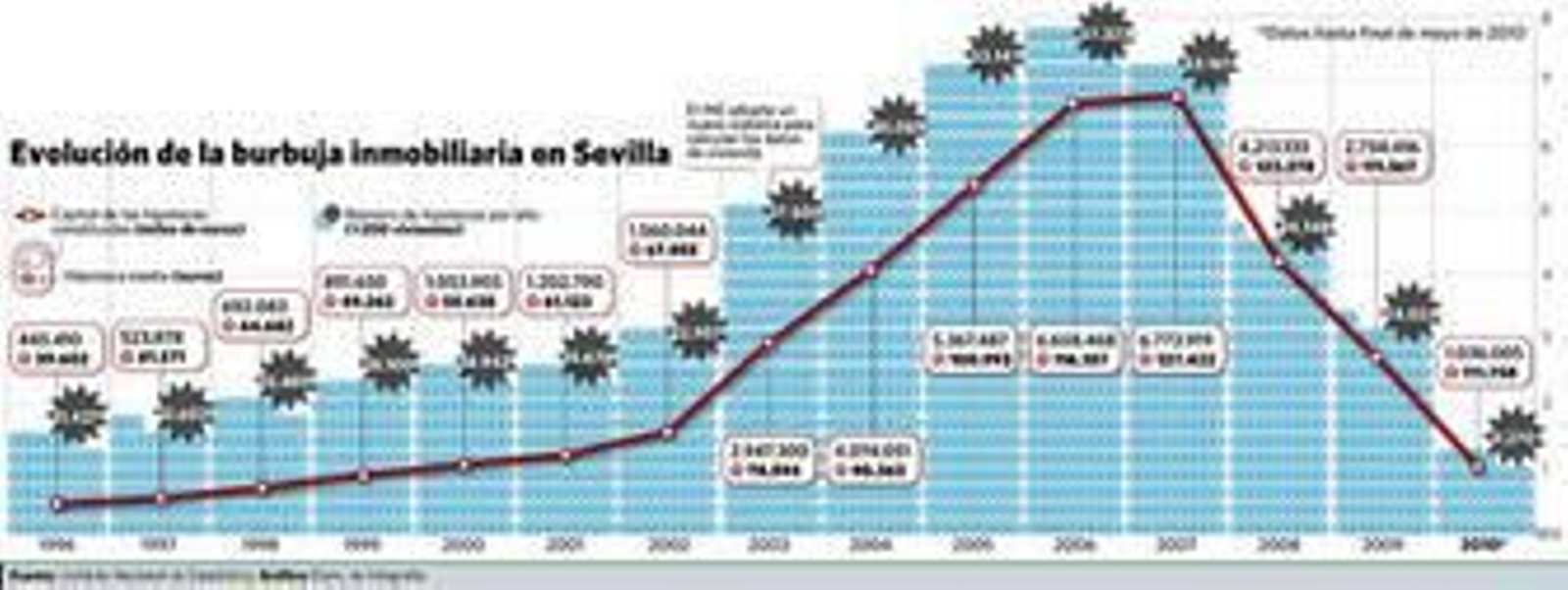 La bajada continúa. No parece que toque fondo. Y lo que es peor, todo hace presagiar que la curva aún descienda más tras el anuncio del Gobierno de recortar las ayudas para el acceso a la vivienda. Sin embargo, en esta crisis hay varios datos a analizar que revelan la actitud de los agentes que operan en el mercado inmobiliario: entidades bancarias, promotoras y compradores. En los cinco primeros meses del año las entidades financieras han prestado en Sevilla más de 1.036 millones de euros, lo que supone un descenso del 5,3% respecto al mismo periodo de 2009. Este porcentaje demuestra el endurecimiento de las condiciones exigidas por los bancos y cajas de ahorros para conceder préstamos. Por contra, la hipoteca media experimentó un leve aumento al situarse en los 111.758 euros, un 0,8% más que en los primeros cinco meses del ejercicio anterior. Esta cifra constata que el pinchazo de la burbuja inmobiliaria aún no se ha traducido en una rebaja considerable del precio de la vivienda en la provincia. Por entidades bancarias, las preferencias de los sevillanos están muy repartidas entre bancos y cajas de ahorros a la hora de rubricar la firma para la hipoteca de una finca urbana, un equilibrio que también se verifica en el caso de las fincas rústicas.
