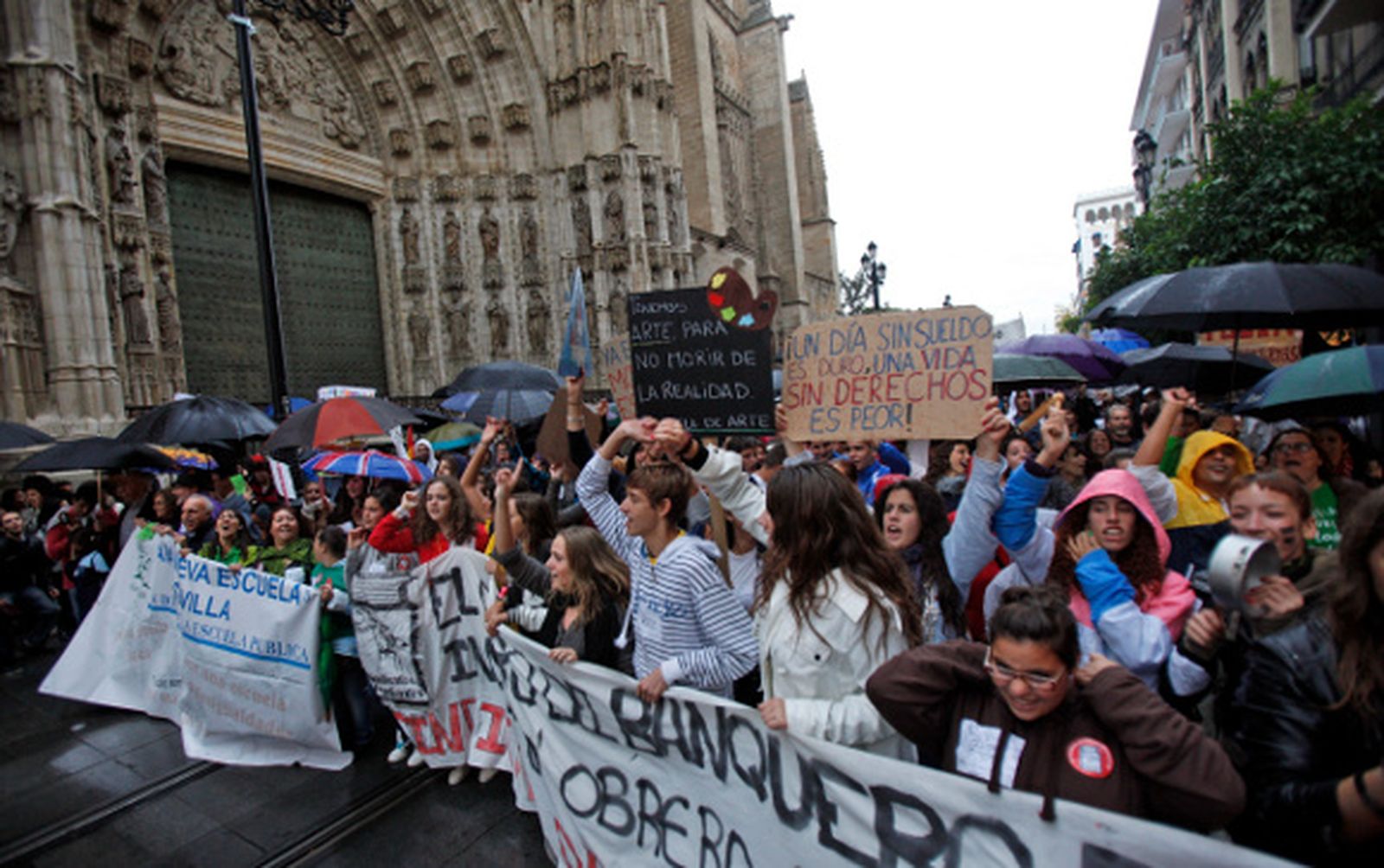 Fuera del debate político, la huelga culminó con manifestaciones en distintas ciudades andaluzas. En el caso de la capital hispalense, la participación se vio afectada por la lluvia que cayó durante toda la tarde. Aunque la convocatoria para que partiera la marcha estaba prevista a las 18:00 en la Puerta de Jerez, no fue hasta media hora después cuando se puso en marcha por la Avenida de la Constitución hasta la Plaza Nueva, donde en principio tendría que haber concluido, aunque la comitiva siguió hasta la Encarnación. A la altura del Antiguo Coliseo se unió otra manifestación protagonizada, principalmente, por estudiantes universitarios. Según las primeras estimaciones de los convocantes, la protesta reunió a unas 1.000 personas.