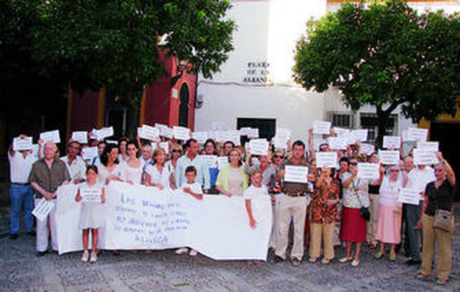 Estaban históricas de la lucha vecinal en el barrio, como Pilar Bores, azote de los gobiernos municipales de los primeros años noventa, cuando los Jardines de Murillo eran pasto de las botellonas. "A ver si se entera todo el mundo que la historia del barrio de Santa Cruz son sus calles". Estaba la actual presidenta de la asociación, María José del Rey, que se pasó la mañana repartiendo octavillas por las casas para convocar a los vecinos a una movilización vespertina, después de que los operarios municipales hubieran intentando sin éxito a primera hora de la mañana colocar el rótulo de Indalecio Prieto. "En esta barrio no hay nombres de políticos. Aquí las calles son Agua, Vida, Aire... ¡Escuchen a los vecinos, por favor!" Estaba el cura del barrio, el canónigo Pedro Ybarra, junto a sus feligreses, portando religiosamente el cartel de rigor: Todos somos Plaza de la Alianza. Estaban padres y estaban hijos. Unos cien vecinos que se quejaron pacíficamente durante más de media hora y que dieron simbólicamente la vuelta a la plaza para terminar el acto.