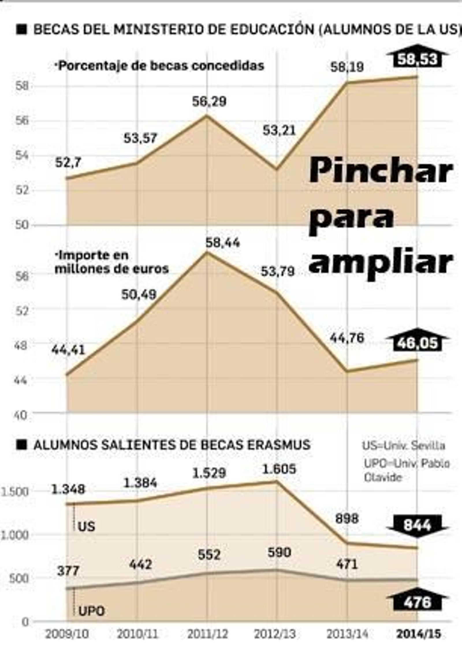 Más beneficiarios pero menos importe económico. Tras la implantación en 2012 del nuevo régimen de ayudas del Ministerio de Educación, el número de becas concedidas se ha incrementado más de cinco puntos porcentuales. Sin embargo, el importe de las becas ha caído hasta un 21% en el caso de los estudiantes de la Universidad de Sevilla, retrocediendo a los niveles del curso 2009-2010.