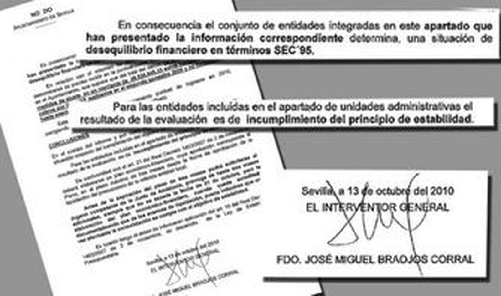El interventor realiza en el informe de 2009 una consideración global al evaluar que en la propia entidad local (Ayuntamiento) y sus organismos y entidades dependientes se aprecia un incumplimiento del principio de estabilidad presupuestaria. El alto funcionario municipal define la estabilidad presupuestaria -concepto en el que se basa todo el informe- como "la situación de equilibrio o superávit computada en términos de capacidad de financiación de acuerdo con la definición contenida en el sistema europeo de cuentas nacionales y regionales en las condiciones establecidas para cada una de las administraciones públicas".