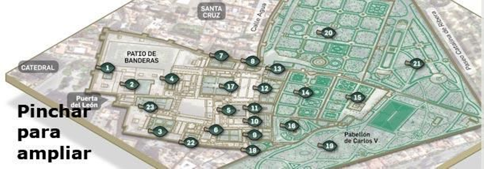 Cuando en el siglo XVI se amplían los jardines más allá de la muralla, se ordenan y se crea la Galería del Grutesco, en 1620 por el arquitecto Vermondo Resta. "Sirve para dar una nueva lectura. Para mirar desde otro punto de vista". Uno de los espacios más singulares del XVI es el Cenador de Carlos V. Plaza revela que seguramente para su construcción se reutilizara un orador islámico: "La hipótesis más razonable es que existiera una qubba islámica. Vemos una vez más cómo se aprovecha un elemento preexistente al que se le da un gran valor, se renueva y se reinterpreta". Los nombres de los jardines actuales también proceden de la documentación del siglo XVI.