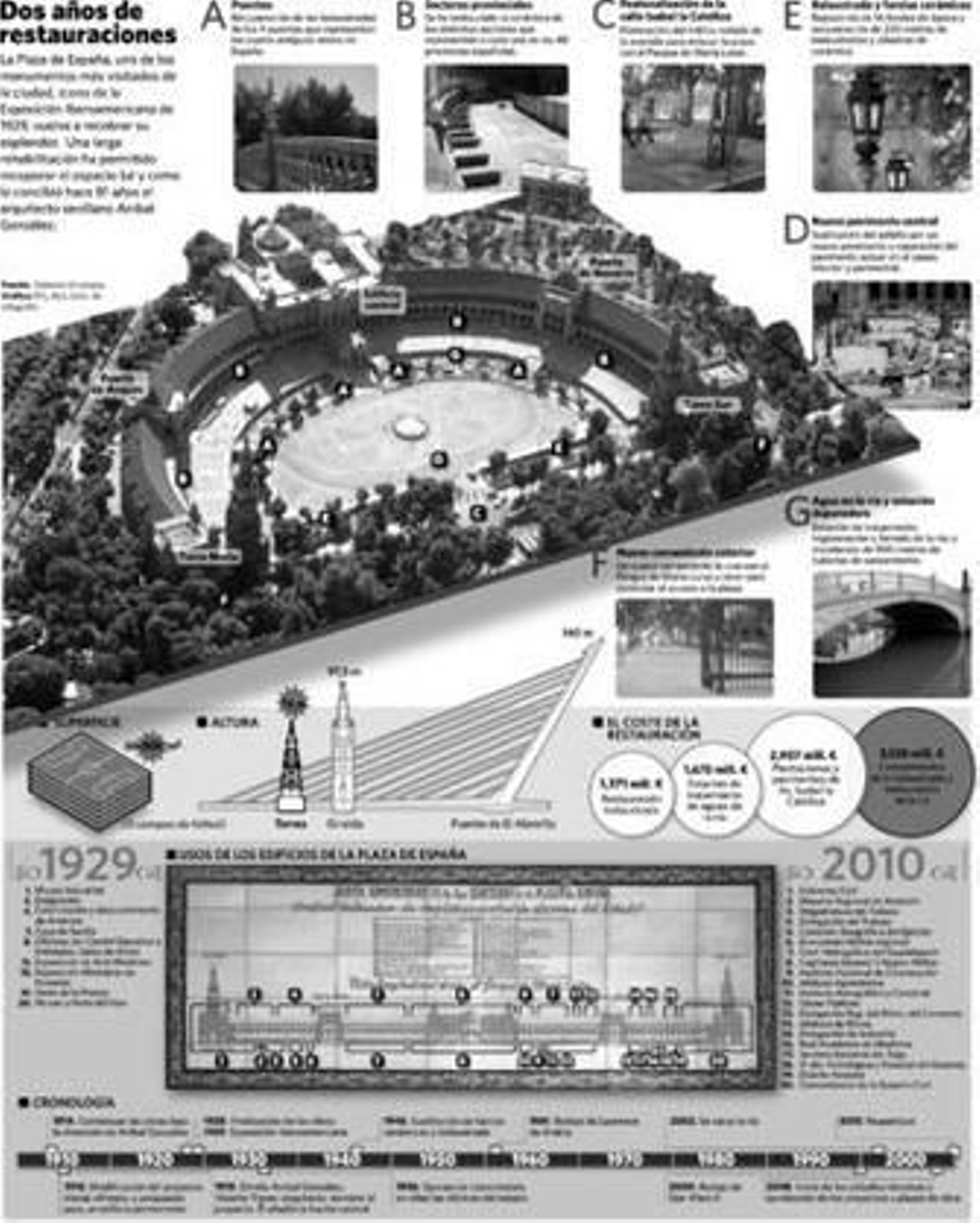 Tras dos años de obras y nueve millones invertidos, la ciudad se reencuentra con unos de sus monumentos más queridos y que le dan fama en el mundo: la Plaza de España, obra cumbre de Aníbal González. Como aperitivo a la ceremonia oficial que se celebrará hoy a las 12:00, ayer se pudo disfrutar de un concierto de la Orquesta Sinfónica Municipal que tuvo como momento más emotivo la interpretación por parte del tenor Paco Heredia del himno de la Exposición Iberoamericana del 29, compuesto por los hermanos Álvarez Quintero. En el evento, al que acudieron unas 3.000 personas, también actuó el cantaor Guillermo Cano. Un juego de luces iluminó con formas geométricas y los colores nacionales la fachada principal del monumento.