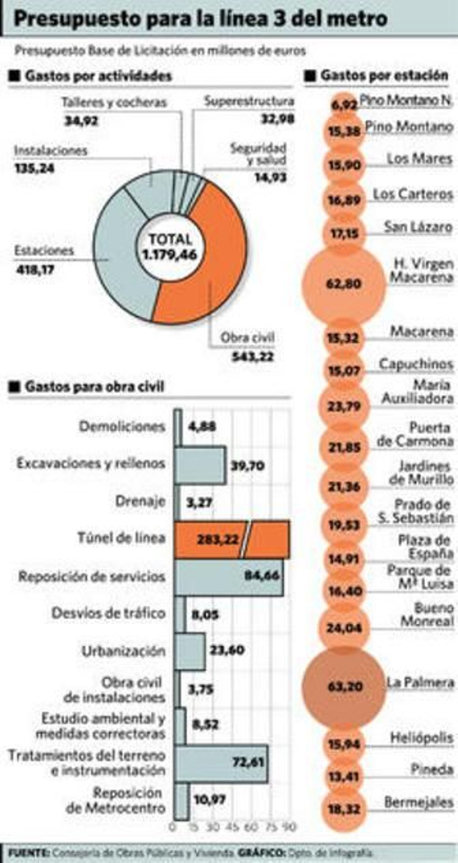 La obra civil cuesta 543 millones, de los que 283 se gastan en el túnel propiamente. Las estaciones costarán 418 millones del total. La parada más cara (62,80 millones) es la del Hospital Virgen Macarena por el subterráneo que salva. Le sigue la estación de la Palmera (63,20) por su condición de intercambiador. Sin contar la de Pino Montano Norte, la única que va en superficie (6,92 millones), la más barata de la línea es la de la Plaza de España (14,91 millones).