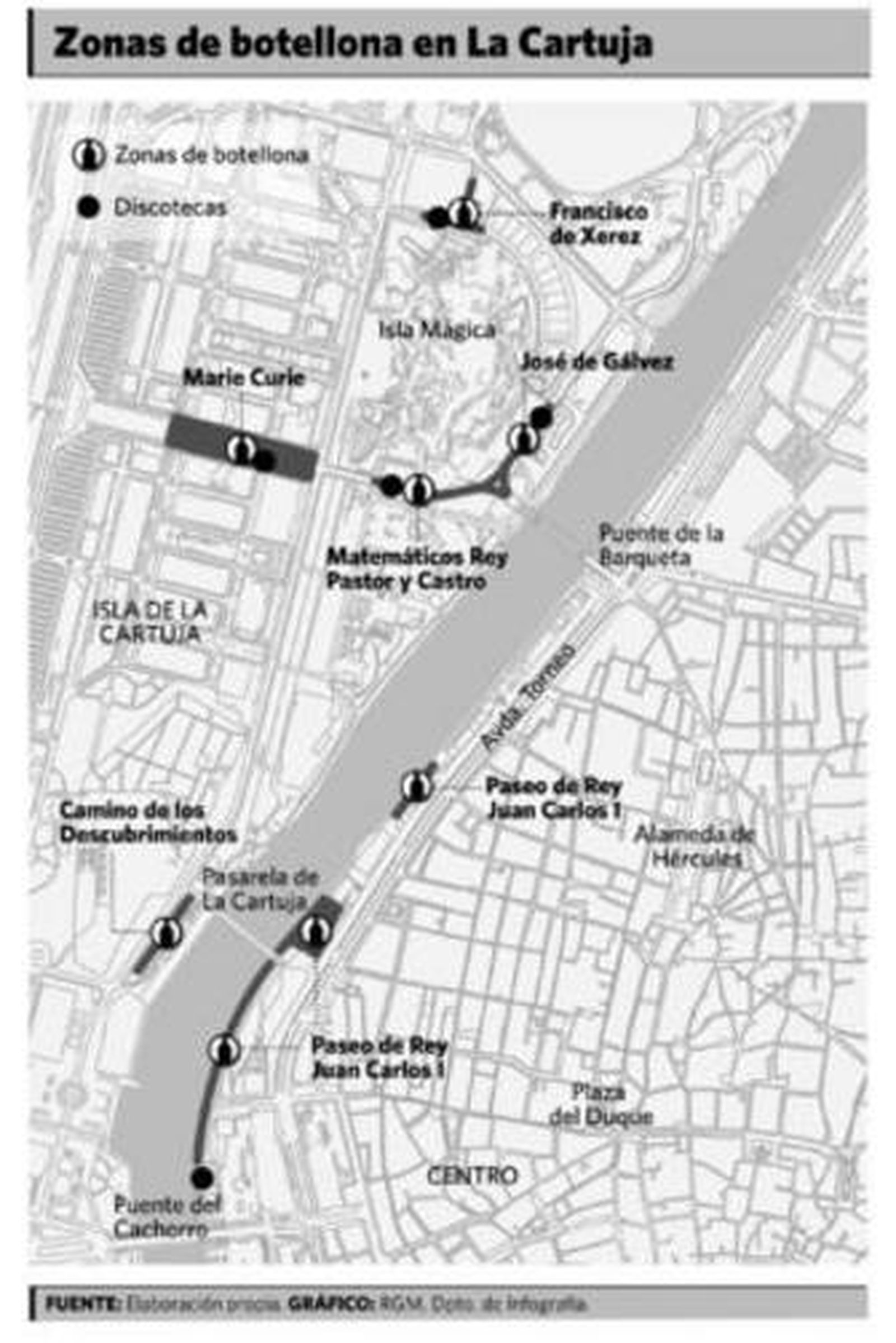 Sin embargo, las discotecas situadas en la Cartuja insisten en que los agentes municipales llevan mucho tiempo sin poner una multa a los jóvenes que beben en aquella zona. El hecho de ser una zona de la ciudad sin viviendas próximas ha convertido la Cartuja en una especie de botellódromo improvisado.