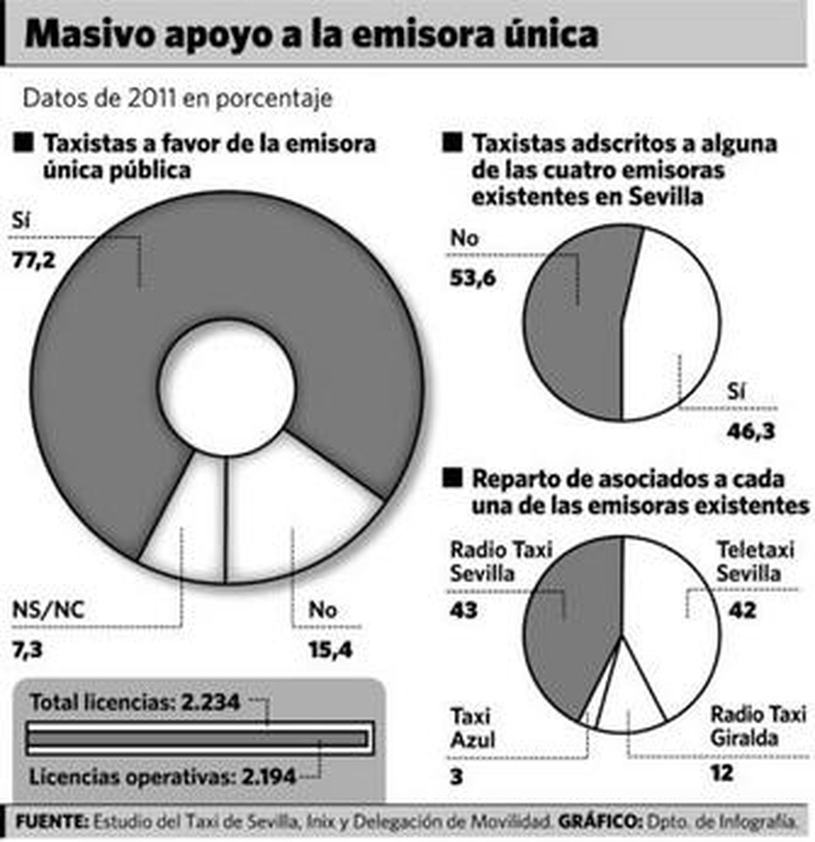 El estudio sobre la situación del sector del taxi (encargado por el Consistorio y elaborado por la consultora Inix) viene a confirmar el descontrol de este transporte público en concesión por la histórica dejación de funciones del Ayuntamiento, la administración que por ley debería velar por su funcionamiento. También expone a las claras y por primera vez que el gremio del taxi apoya masivamente una emisora pública única que mejore el servicio al cliente, y que para modernizar de verdad el servicio de taxi sevillano no basta sólo con reducir 462 licencias.