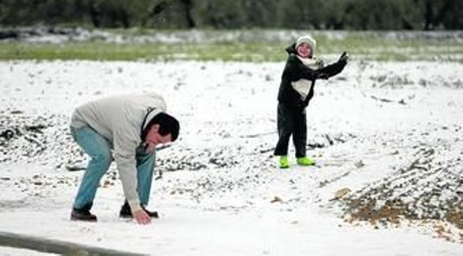 "Aquí hace mucho que no nieva, la última vez que lo hizo fue el mismo día que nevó en Sevilla. Aquel día cayó nieve en toda la provincia", comentaba otra vecina de Cantillana, municipio situado a 45 metros sobre el nivel del mar. Lo decía mientras miraba el campanario de una iglesia en el que una cigüeña permanecía erguida en su nido ajena al temporal. "A ver si cuaja, ojalá". Donde cuajó fue en un municipio cercano, Alcalá del Río, a tan sólo 13 kilómetros de la capital. Allí un grupo de personas bromeaba a las puertas de un bar arrojándose bolas de nieve. "Aprovecha ahora y te lavas", le decía un joven a otro, a pocos metros de una señal de tráfico completamente congelada. "En Guillena ha nevado mucho, estaba todo blanco", comentaba uno de los jóvenes que jugaban con las bolas de nieve. "Yo vivo en Villaverde y allí había dos dedos de nieve esta mañana", explicaba otro.