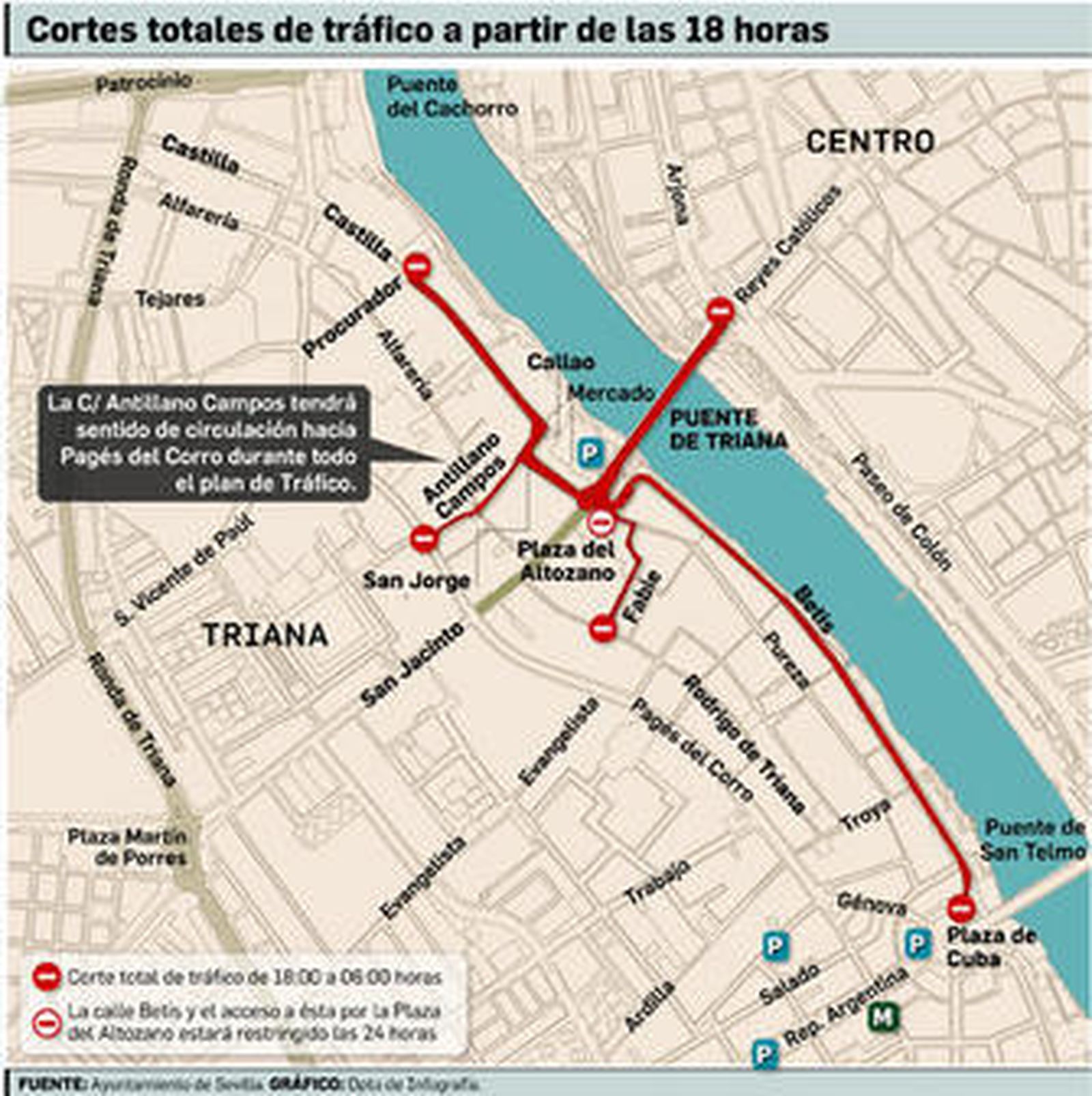 Las calles San Jorge, Callao, Castilla, Antillanos Campos, Plaza del Altozano, Puente Isabel II y Fabie quedarán exentas de tráfico del 21 al 27 de julio de seis de la tarde a seis de la mañana. Estas vías serán utilizadas en caso de evacuación peatonal ante una emergencia y los vehículos se desviarán hacia Pagés del Corro y Procurador. Además, la calle Betis estará cortado las 24 horas, excepto para residentes acreditados (de 6:00 a 18:00), los usuarios del aparcamiento público hasta las 14:00 y los vehículos de carga y descarga (de 6:00 a 12:00). El nuevo plan de movilidad también contempla la regulación del aparcamiento, prohibiendo el estacionamiento en ambos lados de la calle San Jorge y Callao; y en varios tramos de la calle Pureza.