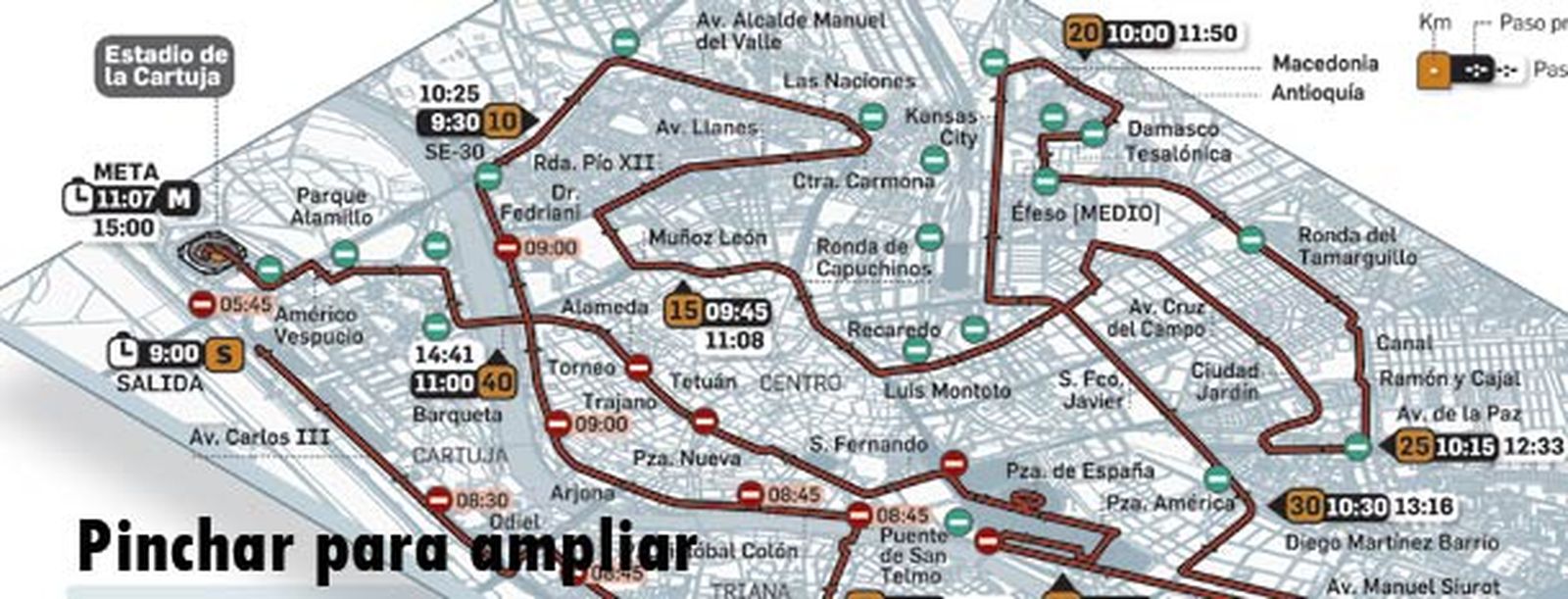 Según informó ayer el Ayuntamiento en un comunicado, la salida se dará a las nueve de la mañana desde la avenida de Carlos III en dirección Sur (hacia el Muro de Defensa) y estará situada a la altura de la confluencia de la calle Hermanos D'Eluyar. A las 05:45, la avenida de Carlos III quedará cortada en dirección Sur por la Guardia Civil en la confluencia de la SE-20 (Ronda Supernorte) con la Glorieta de RTVE. A la misma hora, y en dirección Norte, quedará cortada por la Policía Local a la altura de la calle Marie Curie. La carrera termina con el último corredor teniendo el tope de llegada a las tres de la tarde en el Estadio de la Cartuja.