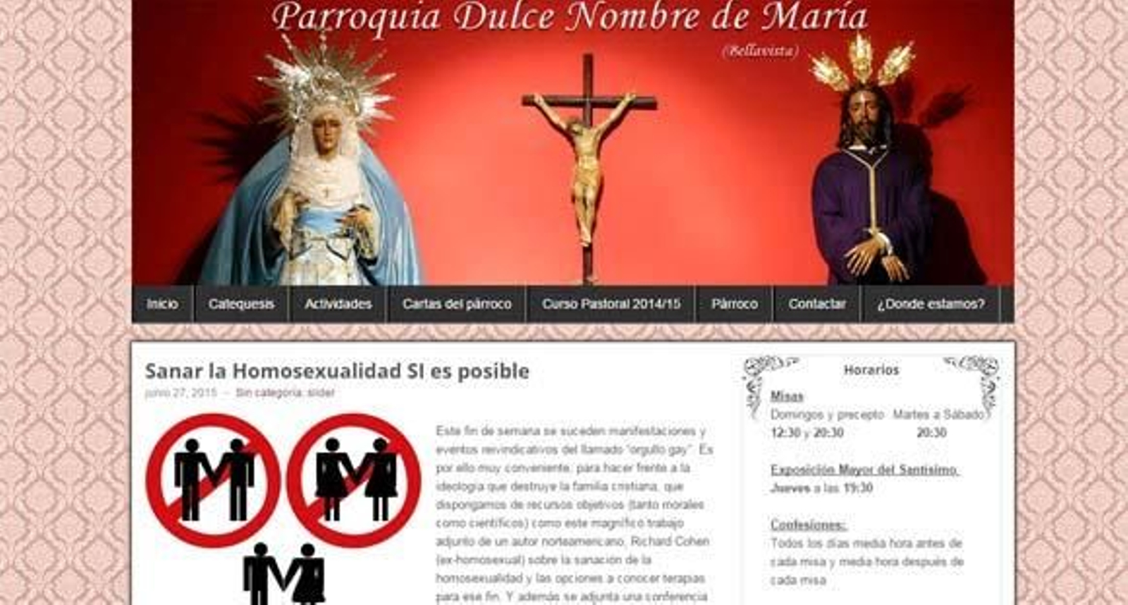 El párroco del Dulce Nombre de Bellavista vuelve a ser actualidad. El sacerdote Santiago González publica en primera plana de la web oficial del templo una entrada que lleva por título Sanar la homosexualidad sí es posible, donde insta a que los feligreses a descargar material técnico-terapéutico recomendado para familias con miembros homosexuales, una condición de la que se plantea una interrogante: "¿Es la homosexualidad una patología o una enfermedad?"