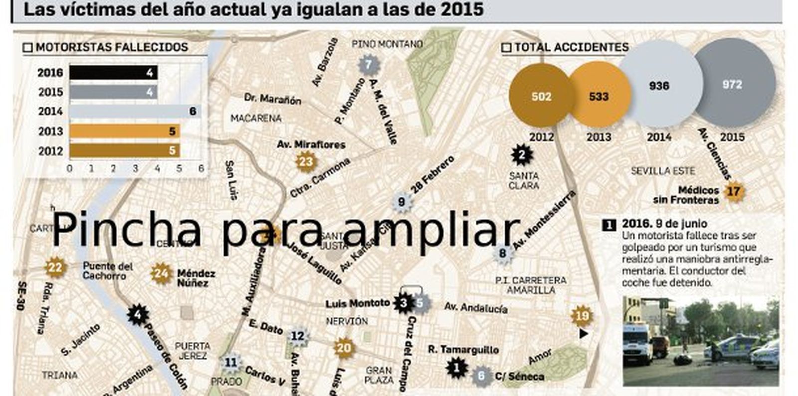 Los dos últimos accidentes con víctimas mortales ocurridos a principios de junio han vuelto a reavivar el debate sobre la seguridad vial en una ciudad que ya suma cuatro motoristas fallecidos en lo que va de año. Se ha igualado ya, en poco más de cinco meses, la cifra de muertos de todo el ejercicio pasado. El Ayuntamiento anunció a principios de año, tras dos muertes ocurridas el mismo día, el 3 de febrero, que pondría en marcha una batería de medidas para hacer de Sevilla una ciudad más segura. Sin embargo, los moteros se quejan de que en la práctica no se están aplicando soluciones sino simples parches que poco ayudan a reducir la siniestralidad.