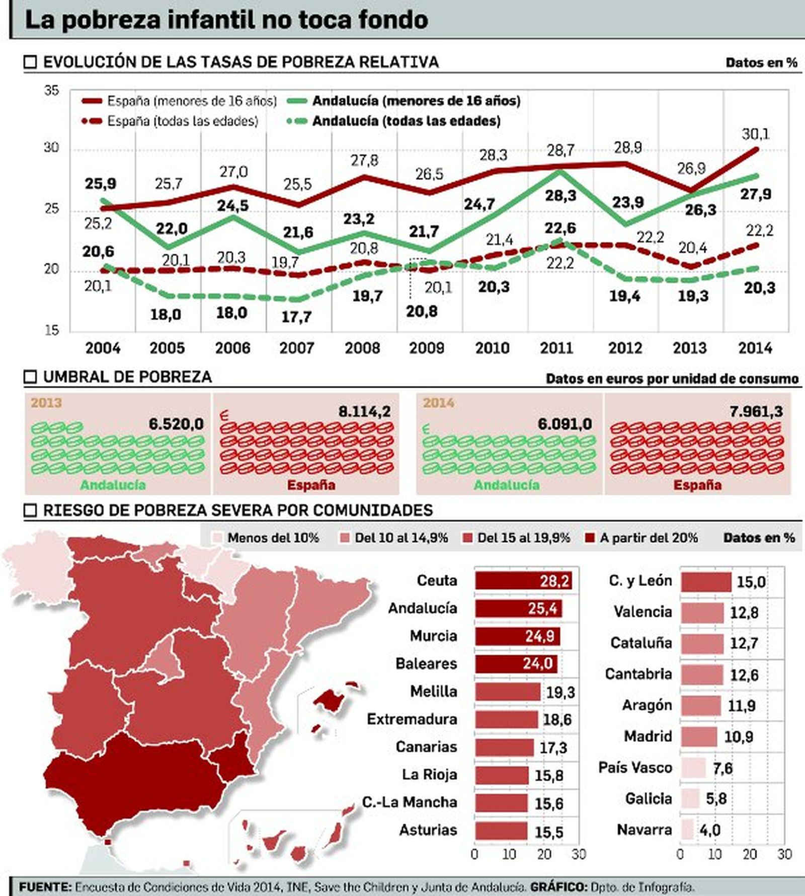 Además, el 25,4% de los niños andaluces viven en hogares con una renta inferior al 40% de la renta mediana, lo que se considera una situación de pobreza severa, según la Encuesta de Condiciones de Vida 2014 (INE), datos facilitados por Save the Children. Si se tiene en cuenta la renta media nacional, Andalucía es la segunda comunidad con mayor tasa de pobreza severa, sólo por detrás de Ceuta, con una tasa del 28,2%.