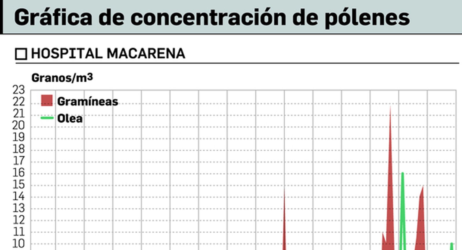 Según los recuentos que se realizan en la estación del Hospital El Tomillar, que están actualizados hasta el 15 de abril, la concentración del polen de las gramíneas alcanza los 39 granos por metro cúbico; mientras que el olivo se sitúa en los 57 granos por metro cúbico. En la estación ubicada en el Hospital Macarenaa, estas concentraciones eran ligeramente inferiores a fecha de mediados de mes.