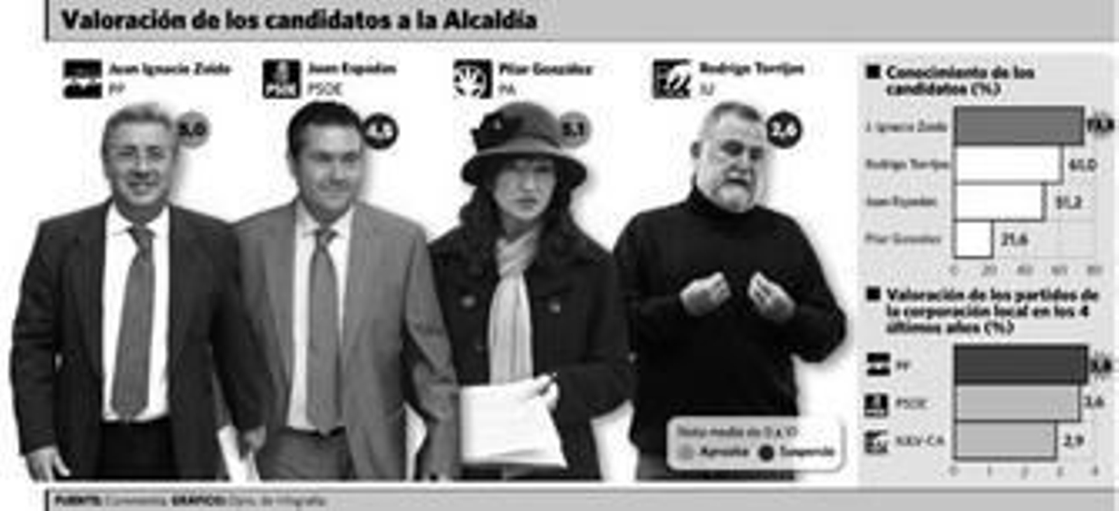 A la pregunta de qué persona entre la lista de candidatos preferiría como próximo regidor de la ciudad, casi un 30% señala a Juan Ignacio Zoido, mientras que Juan Espadas es elegido por un 10,5% de los encuestados. Pilar González, la candidata andalucista, sólo consigue un 6% y el de IU, Antonio Rodrigo Torrijos, un 4,6%. Si se analizan las respuestas dadas en función del tipo de votantes, se encuentran las explicaciones al fenómeno del candidato popular. Ocho de cada 10 personas que en 2007 votaron al PP optan por Zoido como el mejor alcalde. Apenas tiene contestación. Sin embargo, el votante socialista está más despistado. Sólo un 35% dice que el mejor sería Juan Espadas, mientras que el 25,2% no contesta y el 14,7% nombra a otros. Incluso un 11,9% de los que se declaran votante del PSOE cita a Juan Ignacio Zoido como el alcalde que ellos preferirían.