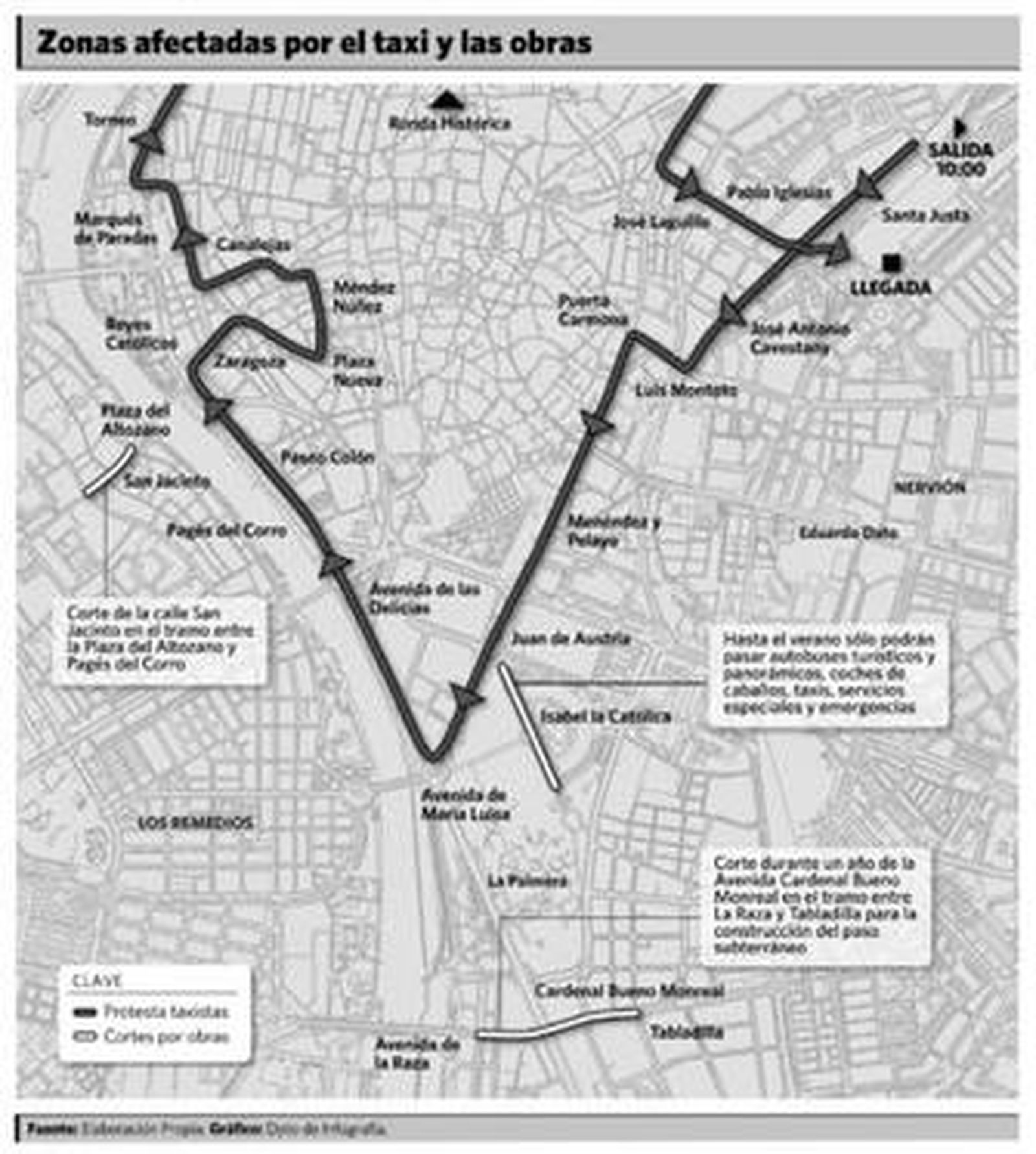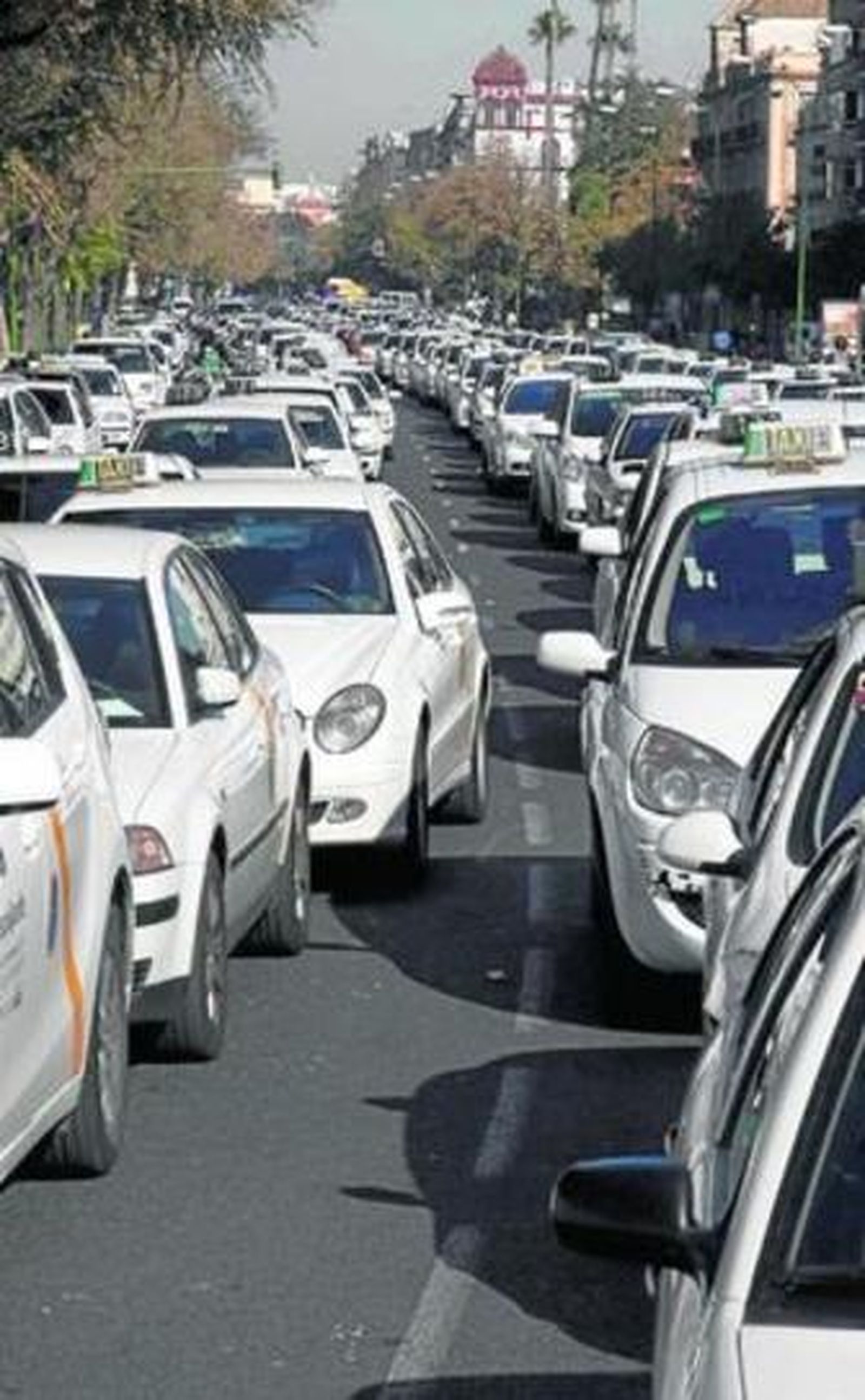 Los titulares de licencia de autotaxi están convocados a marchar, a las diez de la mañana de hoy, desde Santa Justa a la Plaza Nueva y, a la hora del almuerzo, regresarán en caravana a la estación de tren por Torneo, la ronda histórica y José Laguillo. La última vez que protestaron, en vísperas del puente de la Inmaculada, colapsaron la ciudad con 1.500 coches más de 12 horas al dejarlos aparcados en el Prado hasta la noche. La protesta se alargó por la detención de uno de los manifestantes tras agredir supuestamente a un agente de policía. La intención del gremio es volver a colapsar la ciudad para presionar al Ayuntamiento a que ponga sobre la mesa 1,4 millones de euros para retirar de inmediato 25 licencias del taxi que palíen las pérdidas que sufre el sector. Las dos patronales mayoritarias convocan el paro por esta razón y, en general, en protesta por la gestión municipal del taxi, ya que corresponde al Consistorio el control de este servicio público en régimen de concesión.