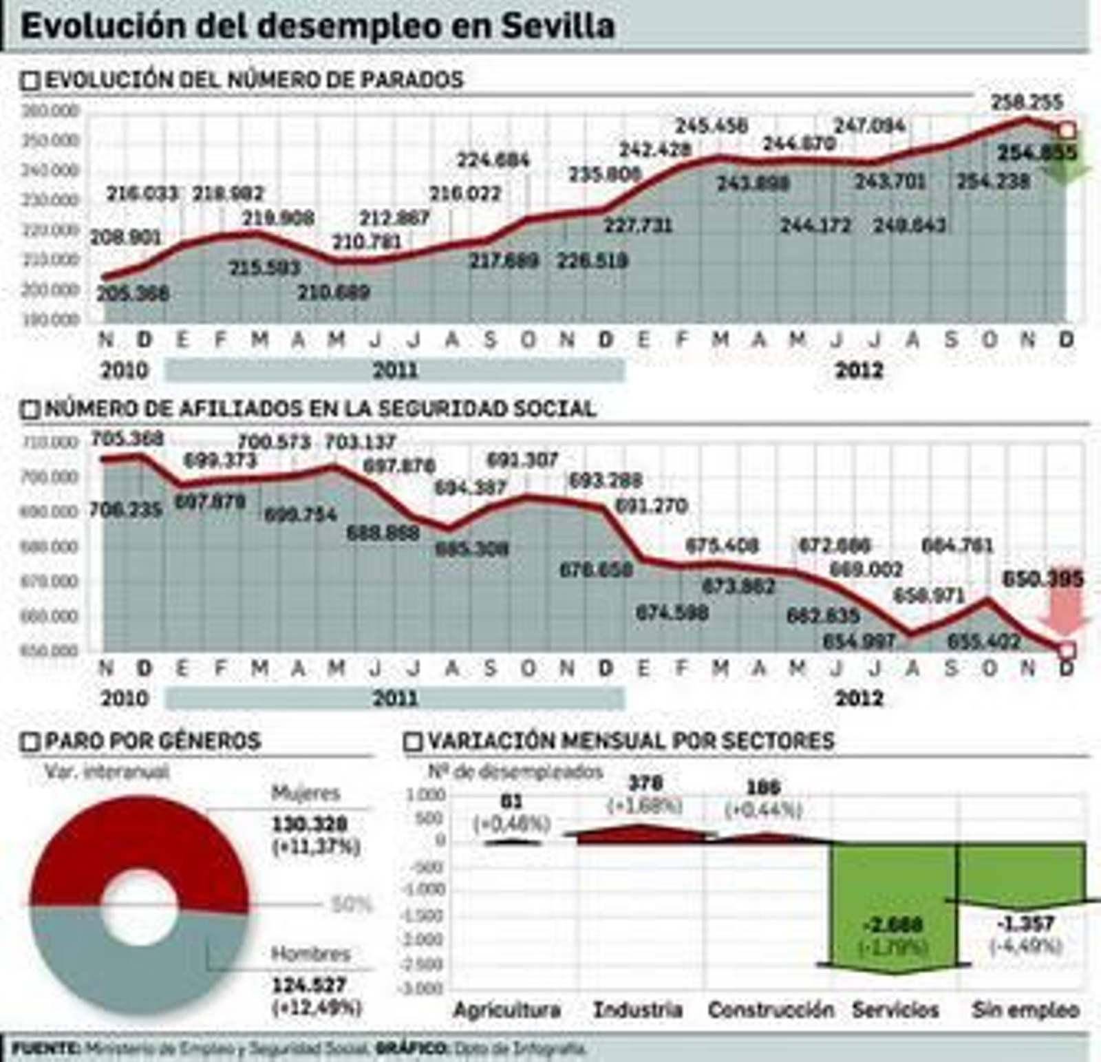 Aparentemente, el dato de diciembre del paro registrado en la provincia de Sevilla es bueno, muy bueno: el desempleo descendió en este mes exactamente en 3.400 personas, hasta situarse en 254.855 al cierre del año. En lo que respecta a los últimos 30 días, es la mejor evolución desde el año 2000, cuando el paro bajó en 3.700. Es, también, el único mes de diciembre de la crisis en el que el desempleo no ha aumentado.