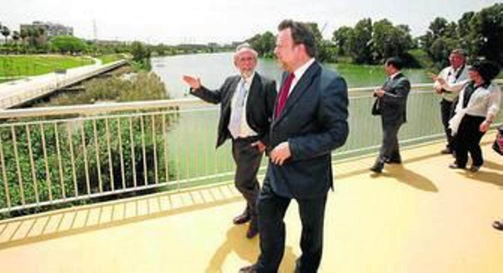 Monteseirín también visitó el nuevo puente, con una longitud de 224 metros, que permite la interconexión entre San Jerónimo y el Parque del Alamillo. Esta pasarela ha sido diseñada en una estructura metálica situada a una altura de 5,58 metros de la lámina de agua en el extremo más cercano a la orilla del Parque del Alamillo, y de 6,97 metros en el extremo próximo a San Jerónimo. Además, se ha acondicionado un paseo fluvial de 1.900 metros de longitud.