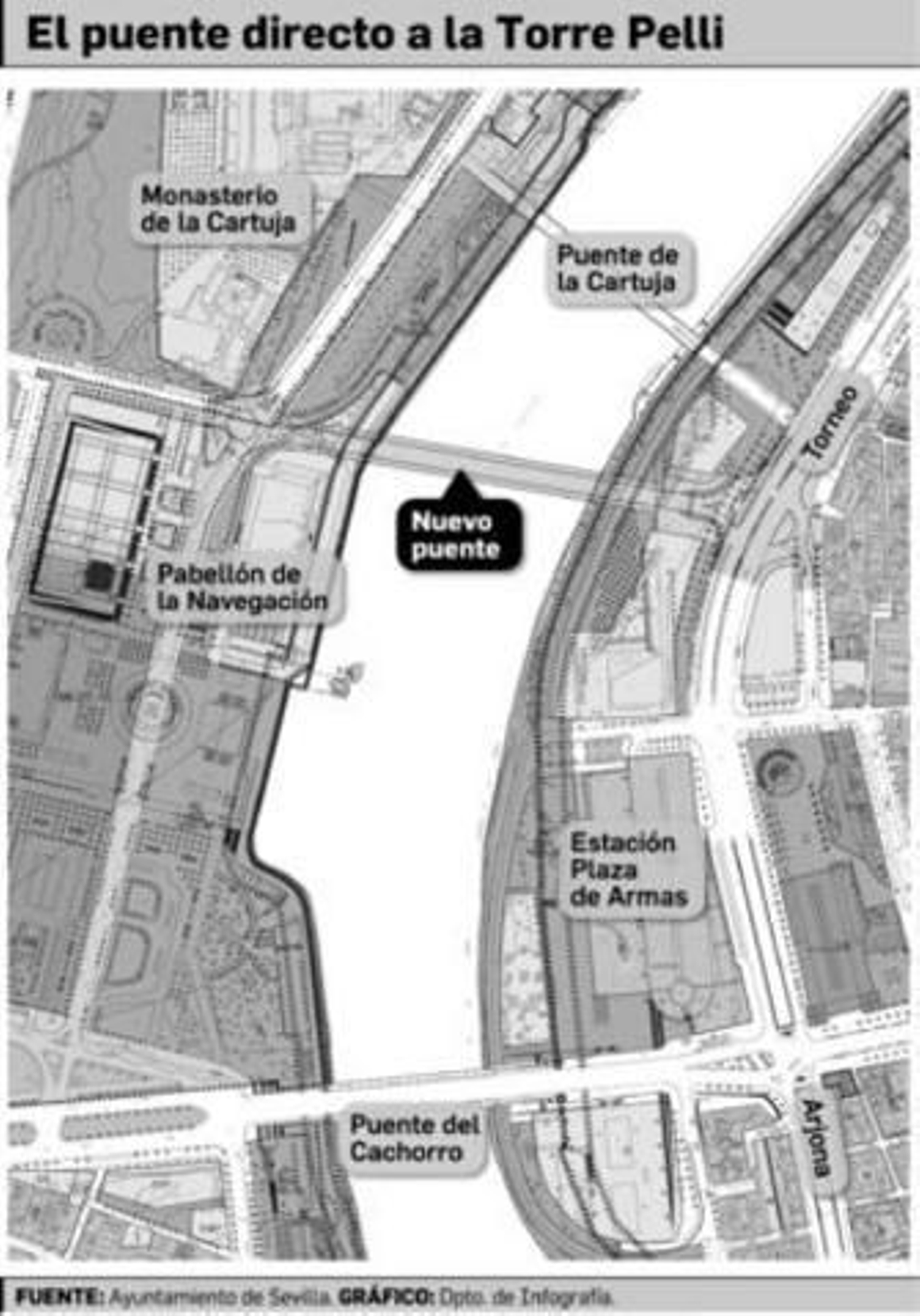 La justificación. El Ayuntamiento justifica la necesidad de este puente para el tráfico rodado en cinco razones que se resumen en la saturación del Puente del Cachorro con todo tipo de tráfico, sobre todo en hora punta, y en la entrada en servicio de la Torre Pelli a medio plazo con sus nuevos usos comerciales, terciarios y administrativo y con un aparcamiento para 4.000 vehículos.