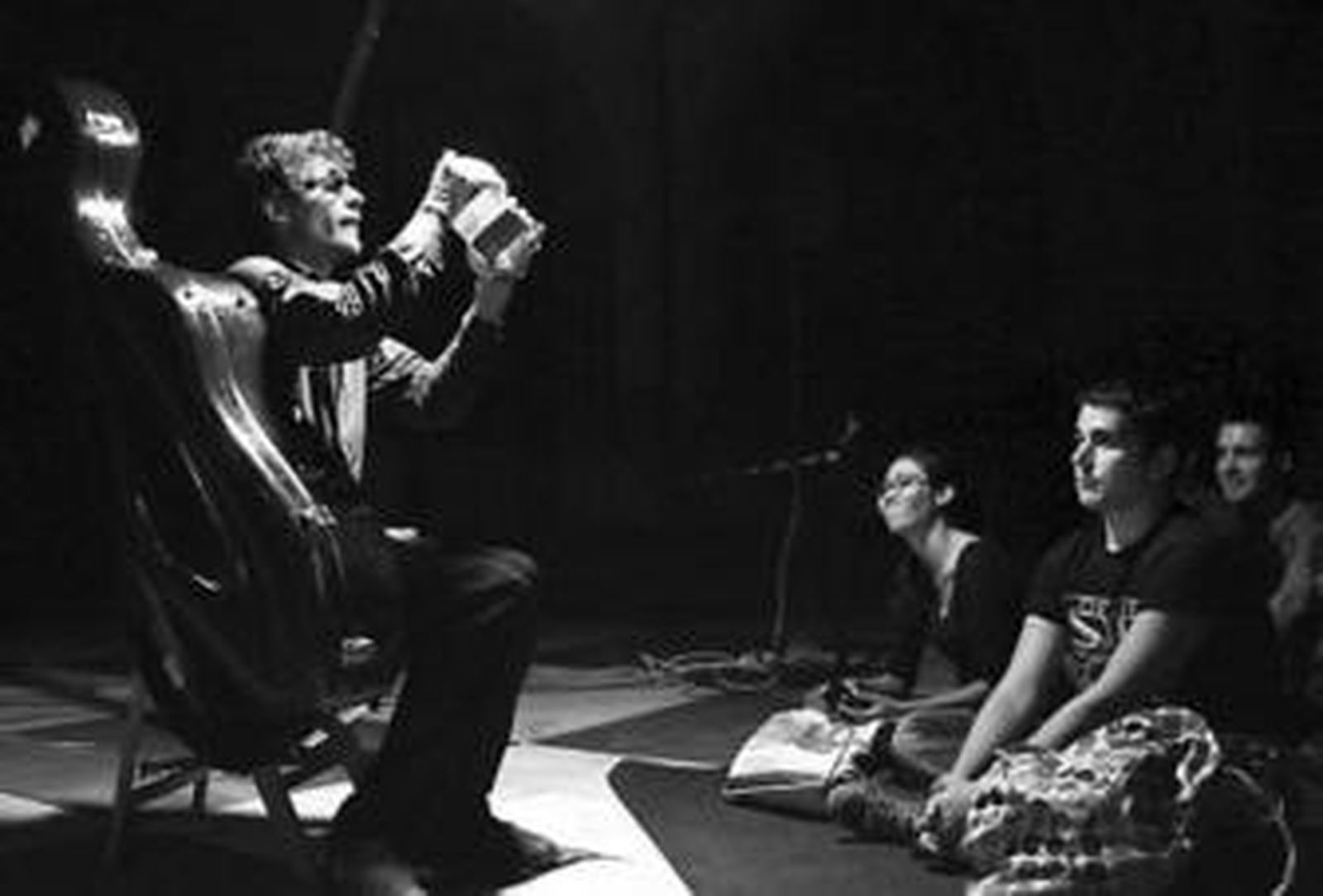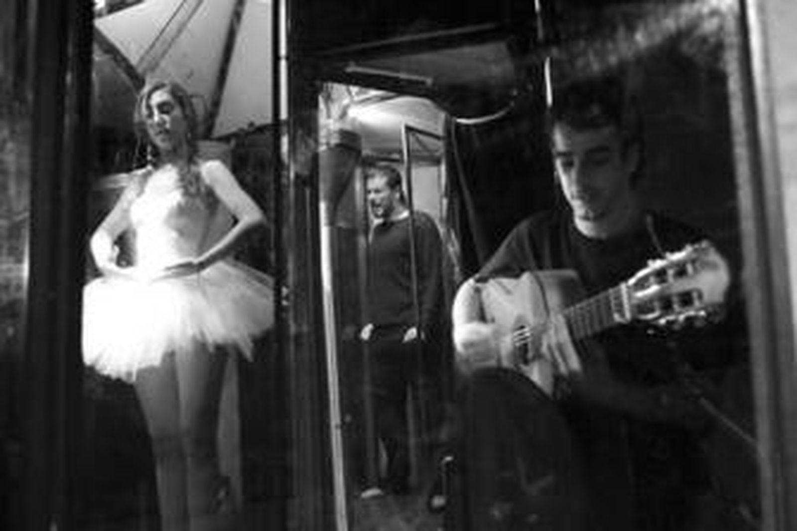 El público permanecía a oscuras, mientras en la singular caja se ponía en juego una combinación de luces que guiaban el curso de la historia. Muchos prefirieron sentarse en el suelo para apreciar más de cerca la particular construcción de madera, hierro, base de caucho y paredes de cristal, que permiten ver la actuación de los artistas.